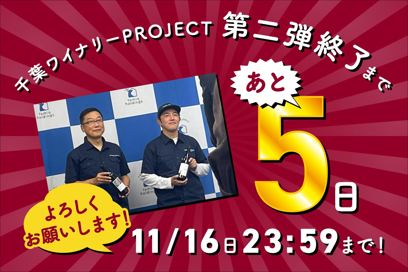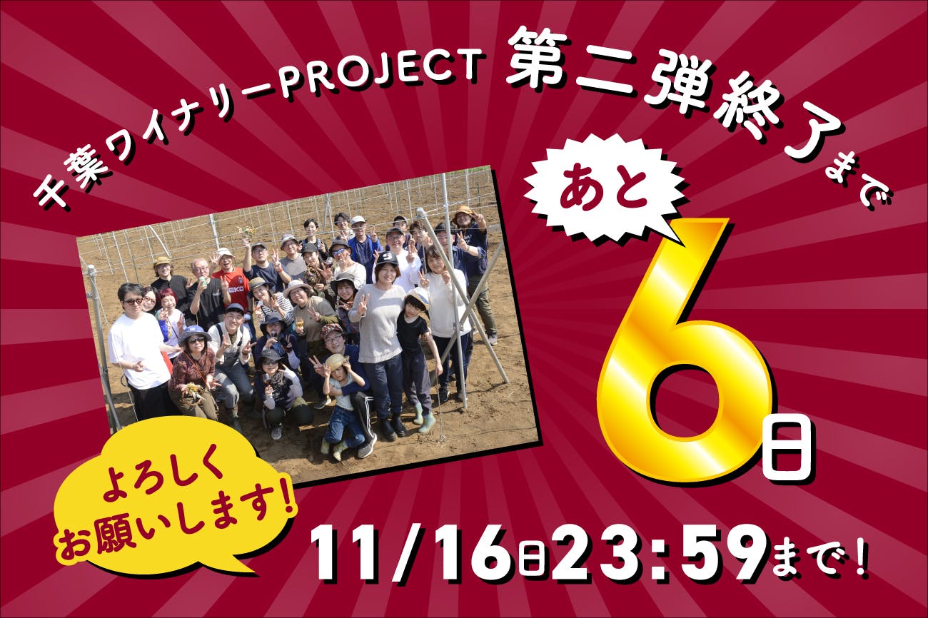 2025/11/10 19:00千葉市初のワイナリー「千葉ワイナリー」にて、初醸造を祝う「TOMIO WINE FESTIVAL」を11/22に開催いたします!皆さまと共に新たな歴史を刻む特別な一日。このイベントは、初醸造という節目を地域の皆さまと分かち合い、千葉から新たなワイン文化と交流の輪を広げていくための第一歩です。当日は、千葉ワイナリーで今期製造した新酒をはじめ、千葉県産ワイン各種を提供予定。さらに、千葉市内の人気飲食店による特別なフード出店や物販も多数登場します。また、千葉県出身の音楽デュオ「mille baisers(ミルベゼ)」によるライブ演奏や、参加型のアートイベントなど、五感で楽しめる多彩なコンテンツをご用意しています!今回のクラウドファンディングでは、この特別な日にご参加いただけるリターンとして、【千葉ワイナリー収穫祭「TOMIO WINE FESTIVAL」プレミアムプラン】をご用意しています。限定のロングTシャツや、各出店者から選りすぐりのスペシャルフード。ライブ特別観覧席のついた、ここでしか購入出来ないプレミアムプランです。ぜひご支援ください。◆千葉ワイナリーの収穫祭「TOMIO WINE FESTIVAL」の詳細は下記にてご確認ください。Instagramhttps://www.instagram.com/chibawinery/「千葉ワイナリーでの初醸造を祝う」という記念すべき瞬間を、ぜひ一人でも多くの方と分かち合い、これからの千葉ワイナリーの挑戦を応援していただけると嬉しく思います。\第2弾 クラウドファンディングに挑戦/あと6日!プロジェクト支援期間https://camp-fire.jp/projects/871361/view■□ご支援■□共感いただけた方は、ぜひご希望のリターンから、ご支援をお願いいたします。■□お気に入り登録■□今は支援が難しくても、「お気に入り登録」をしてプロジェクトの進捗を見守ってください。大きな励みになります。■□シェア■□このプロジェクトを一人でも多くの方に知っていただくため、ぜひSNSやメールでご友人・ご家族にシェアをお願いします。皆様の「シェア」が、私たちの夢を叶える最大の力になります。皆様の温かいご支援、心よりお待ちしております!\第2弾 クラウドファンディングに挑戦/あと6日!プロジェクト支援期間 2025年11月16日(日)23:59https://camp-fire.jp/projects/871361/view もっと見る