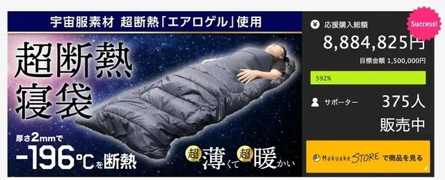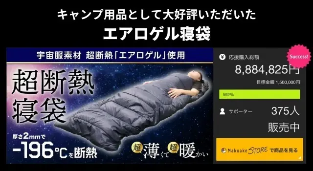 キャンプ用品第1弾として宇宙服素材を使用した超断熱寝袋「AERO WARM」(エアロウォーム)は800万円以上の支援をいただきスタッフ一同感謝感激しております。