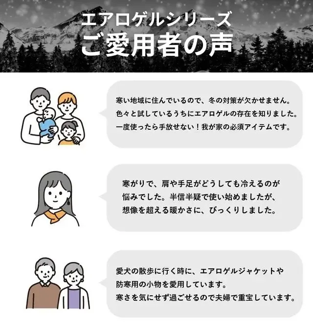 これまで自社で開発・販売を行ってきた「エアロゲルシリーズ」の累計販売総額が2億円*を越え、毎年冬の大ヒット商品として多くの方から支援をいただいております。(*自社EC販売などを含む)
