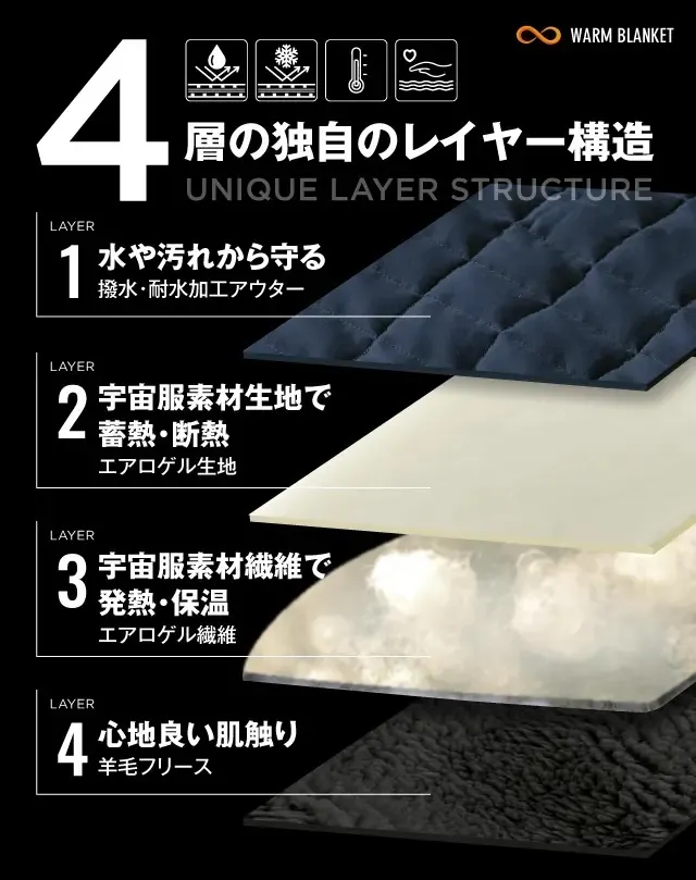 WARM BLANKETは”熱伝導””熱放射”を防ぐ構造に着想した4層の独自レイヤー構造で暖かさをキープします!!