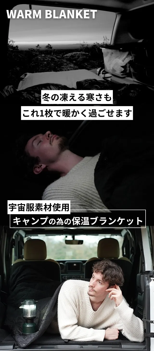 冬の車中泊での寒さ対策はキャンプをするうえで必須になります。車内であってもエンジンを止めると、車内の温度は外気温と変わらないくらい低下します。WARM BLANKETの『発熱・蓄熱』する独自の4層構造が快適なキャンプ体験をお届けします。