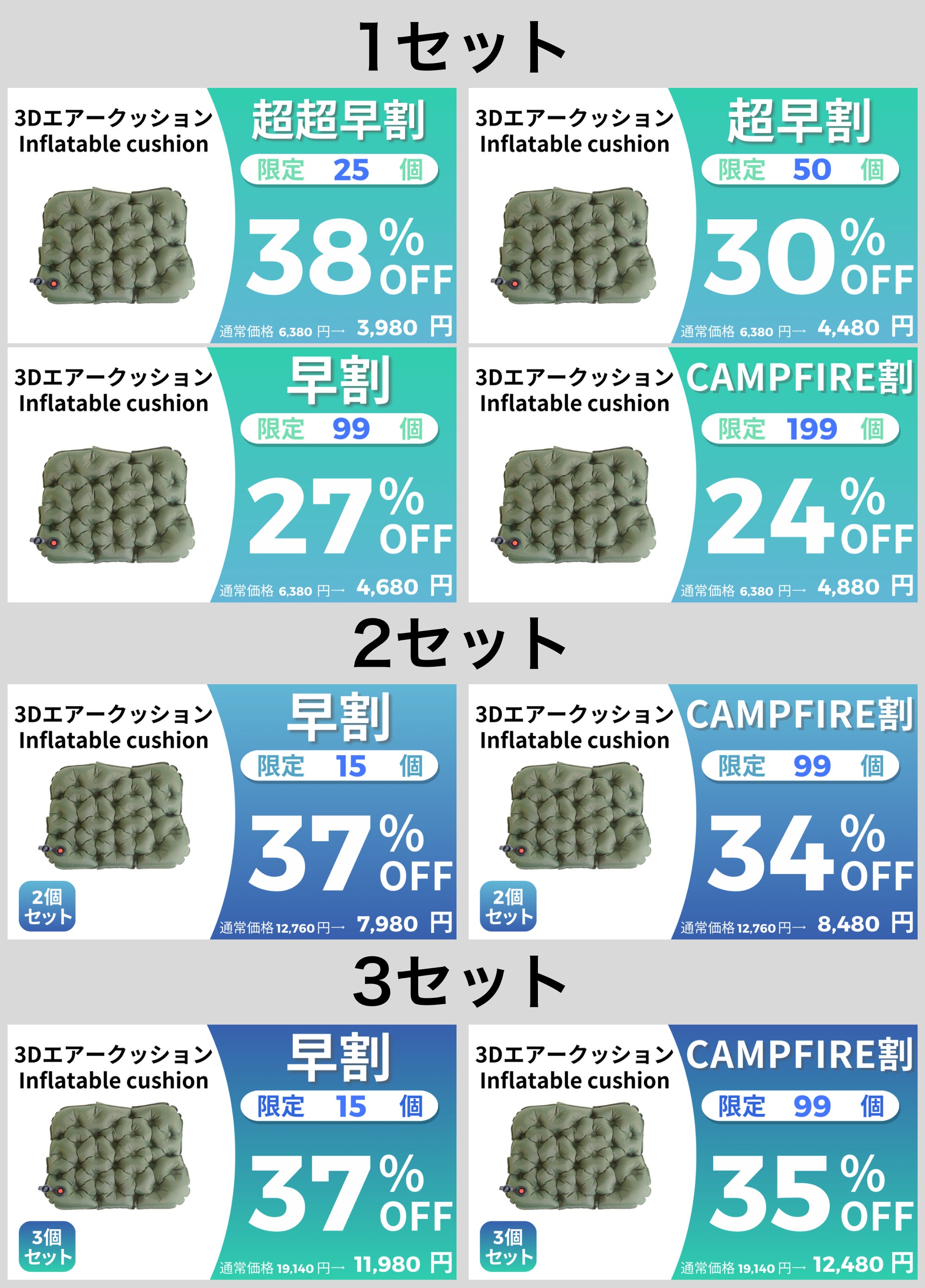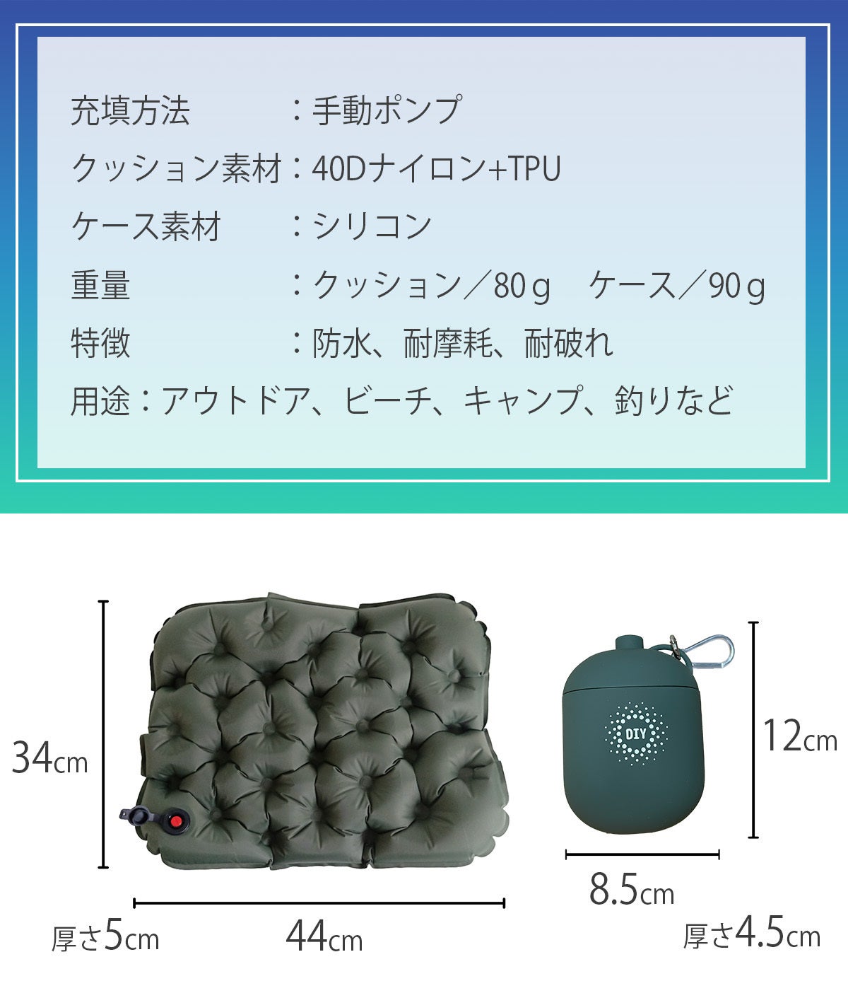 屋内・屋外問わずにとこでも座れるエアクッション。ケースがポンプになるので膨らませるのもたたむのも簡単です。口で膨らませる必要がないので衛生的、かつクッション生地じたいも耐摩耗・耐破れ・防水機能が備わっており、ゴツゴツした場所の多いアウトドアでも長くお使いいただけます。「いつでもどこでも気兼ねなく快適に座りたい」を叶えるアイテムだと思っております。
