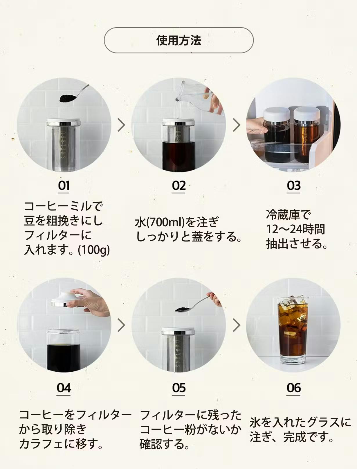 コールドブリュー:冷たい水(または室温の水)を使用して、長時間(通常は12時間以上)コーヒー豆をゆっくりと抽出する方法です。この低温での長時間抽出により、コーヒー固有の味わいが引き出され、苦味や酸味が抑えられます。