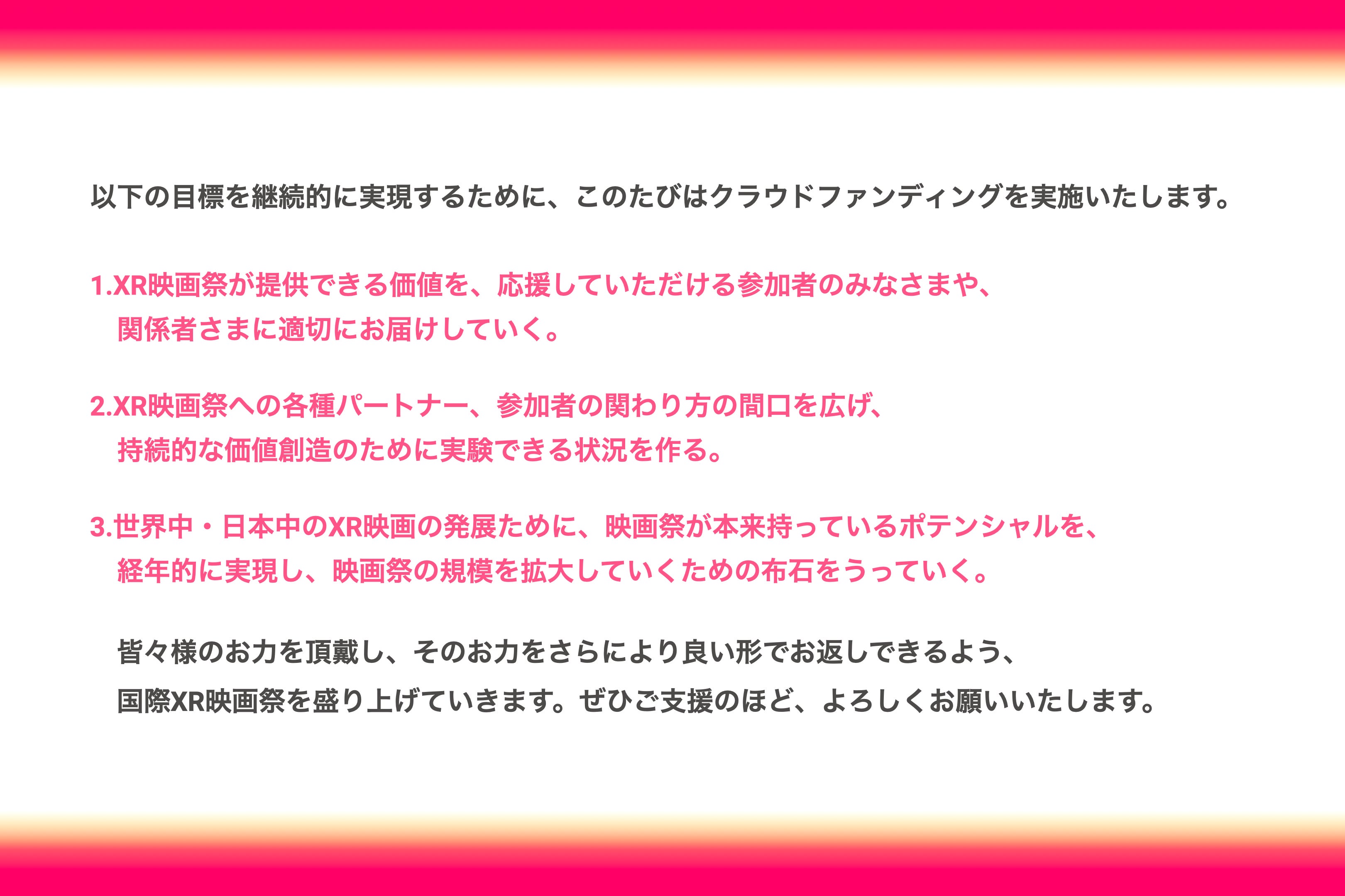 運営一同、世界中のXR作品を鑑賞・体験し、感動し国内に絶対に必要な存在として、このXR映画祭を継続したいと考えています。どうかこの火を絶やさぬよう、ご支援よろしくお願いいたします。