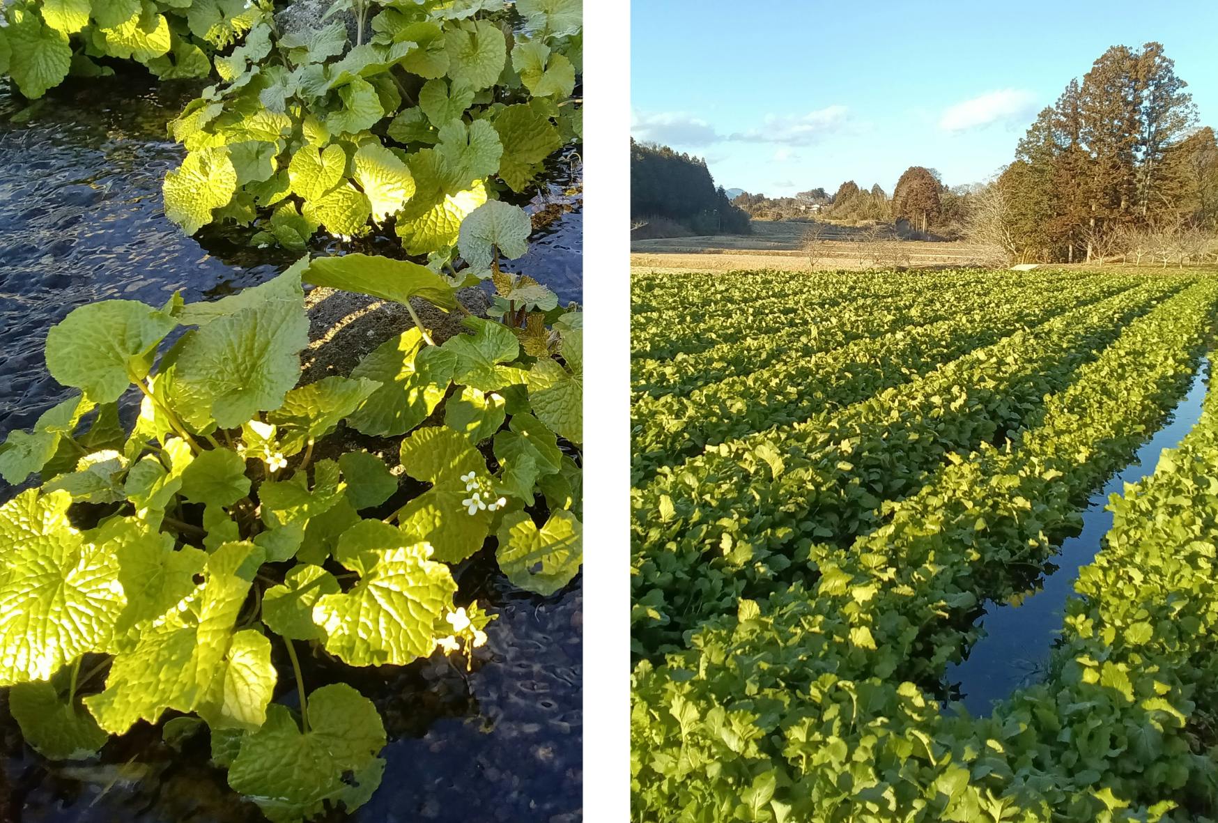 御殿場市は富士山の伏流水が市内に流れていることで有名ですが、「松の葉」がある二子地区は特に水がきれいな場所として有名です。「松の葉」からほど近い「二子水神池」に宿泊者をご案内すると、その透明度に皆さん驚かれます。この湧き水があるからこそ育つ御殿場の名物が「わさび」や「水かけ菜」です。特に御殿場産のわさびは主に料亭やホテルなどに販売され、市内に出回らないと言われるほど希少で品質が高いと言われています。わさびは英語名も「WASABI」である通り、日本を象徴する農作物で海外でも広く知られています。