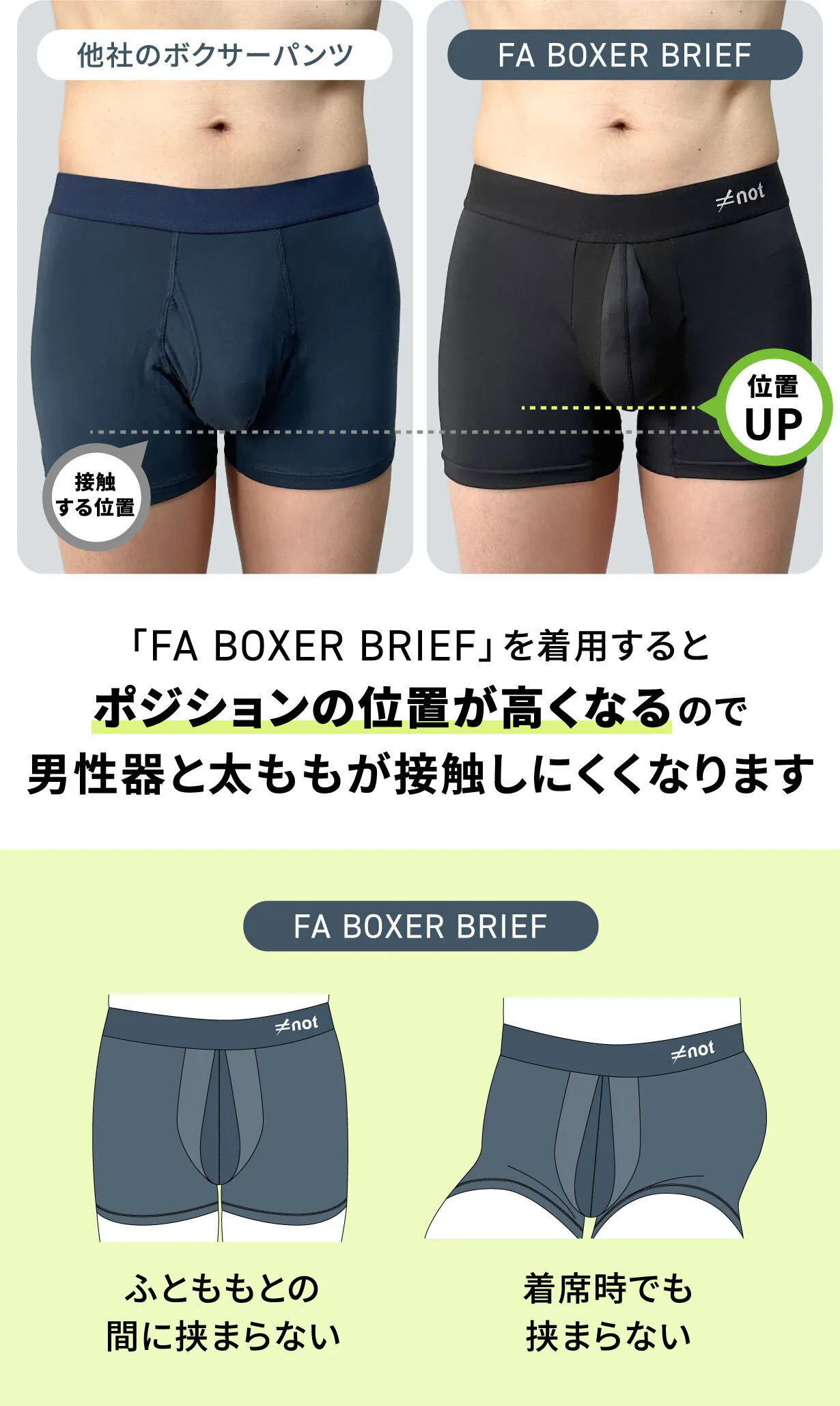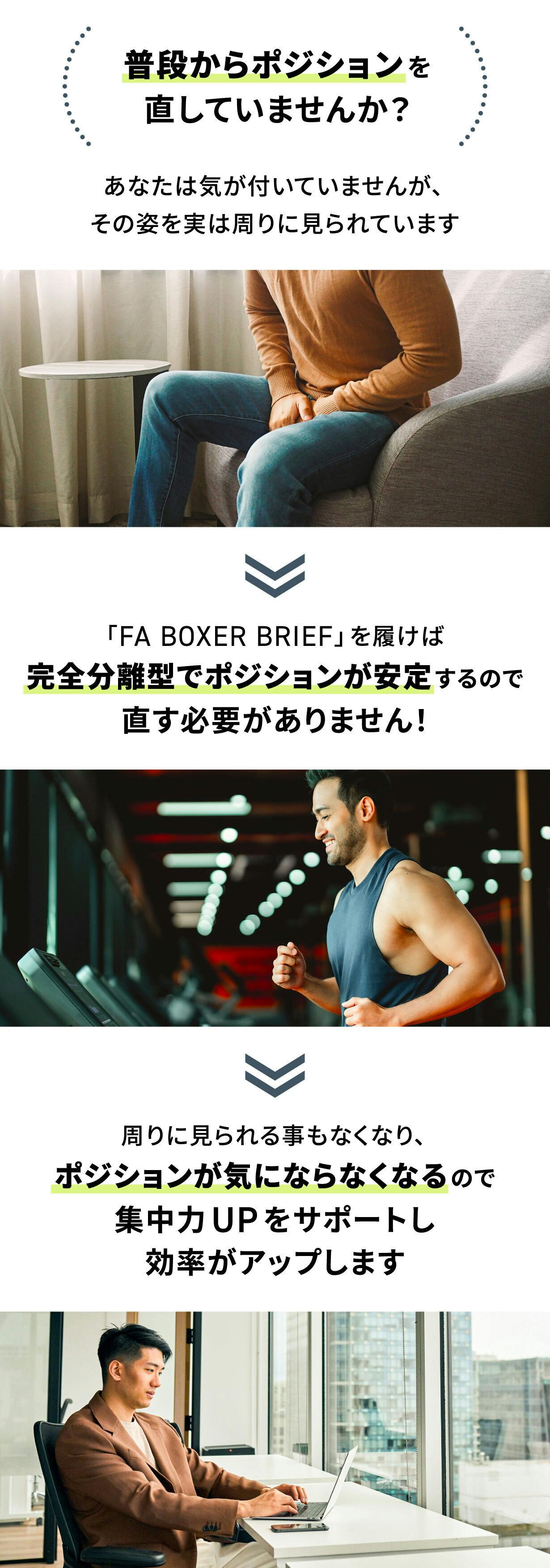 「ポジションが気にならない世界の実現」を目指した完全分離型インナーパンツ「FA BOXER BRIEF」※1は、陰茎と陰嚢を胴体から分離して太ももや部位同士の摩擦レスを実現し、ムレや接触によるベタつきを防ぎます。