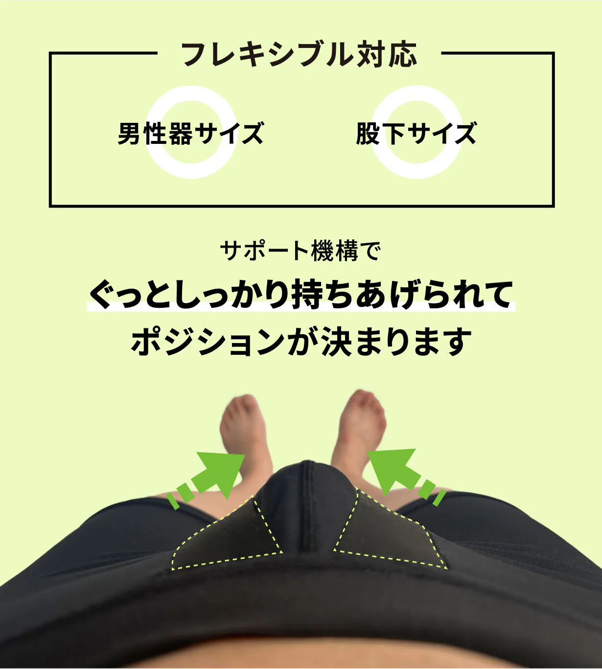 また、特許出願中のポジション保持機能「Go Up Support」により男性器を上向きに保ち、上方に持ち上げながら立体的に固定することで男性器の揺れ/ブレが抑えられポジションが気にならなくなり、さらに足上げ動作も軽くなります。