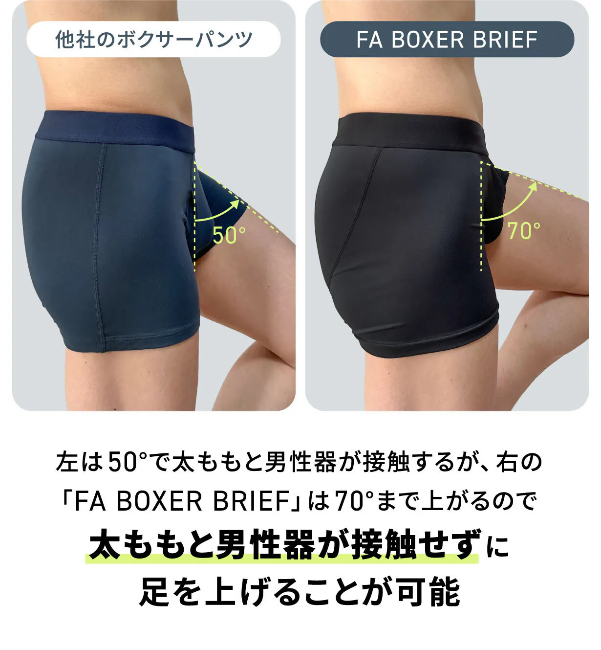 「FA BOXER BRIEF」を履くと男性器が上に持ち上げられた状態で固定されるので、足上げ動作の際に男性器が「足の」動きの妨げになることを防止します。