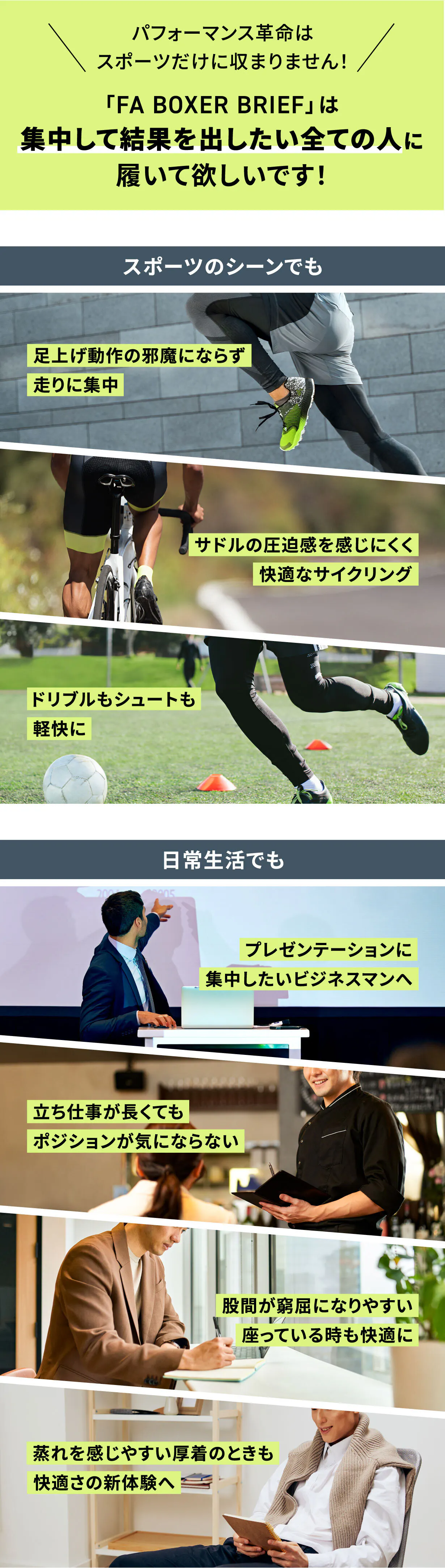 プロスポーツ選手時代の悩みを解消することを目指して、完全分離型インナーパンツ「FA BOXER BRIEF」を作り上げました。この製品を通してスポーツをする全ての男性のパフォーマンスをアップさせて、スポーツのレベルが上がってくれるきっかけになればそれ以上に嬉しいことはありません。