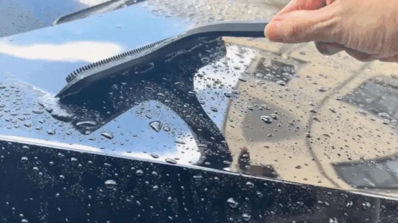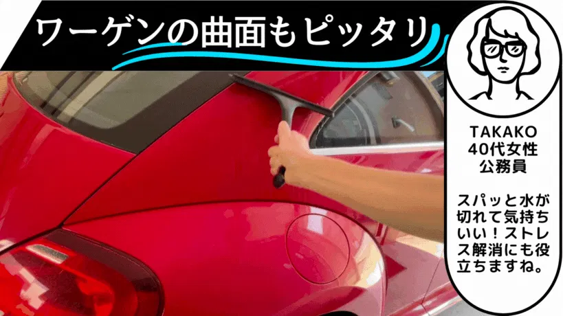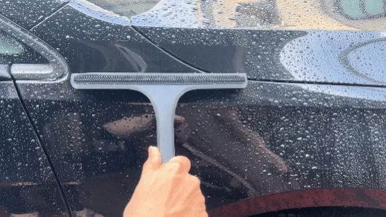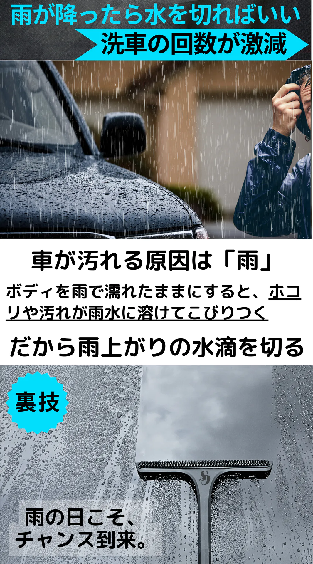 また、裏技として、車で外出して雨に降られて帰宅したら、すぐにカースイーパー(本製品)を取り出して、2〜3分でパパッと水を切っておきます。