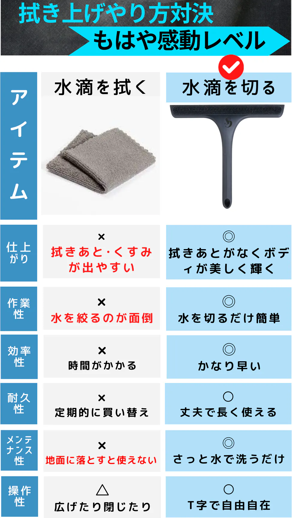 クロスは何度も使っていると車の油汚れが蓄積して、水道で洗った程度では落ちきれません。いくら性能のいいクロスでも、汚れていたら拭きムラが出ます。カースイーパーは、シリコン製なので汚れがさっと落ち、丈夫で長く使えて、さらに拭きムラができません。