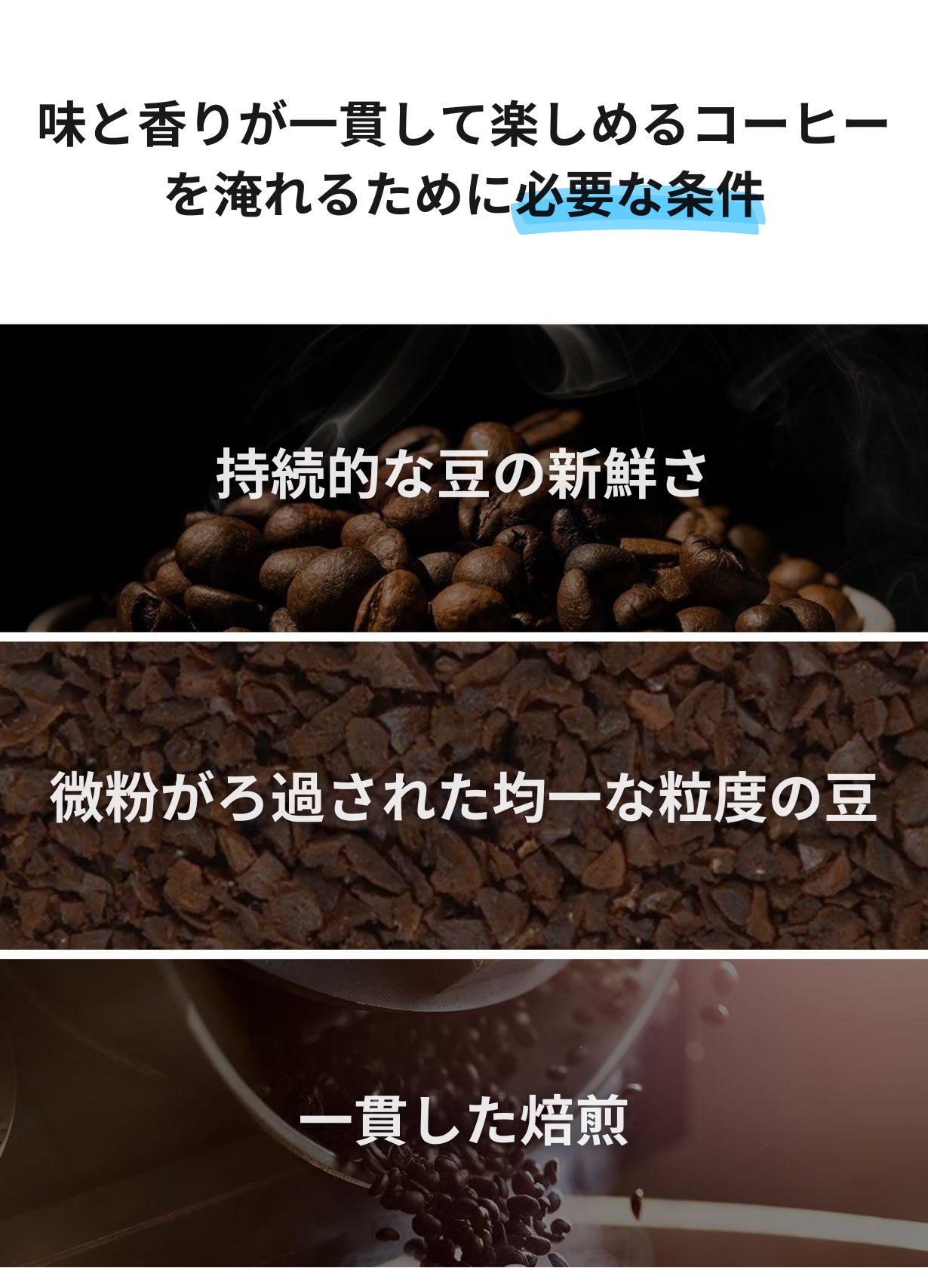 豆を均一にし、細かい不要な部分を除去した上で淹れるコーヒーは雑味がなく美味しく出来上がります。