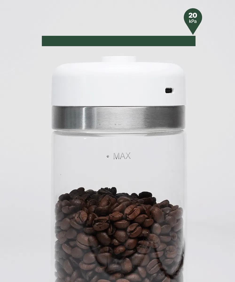 容器内の圧力レベルが20kPa以下に低下すると自動で調節。そのため、常に強力真空の状態を維持しコーヒー豆や中の食材が常に新鮮に保たれます。