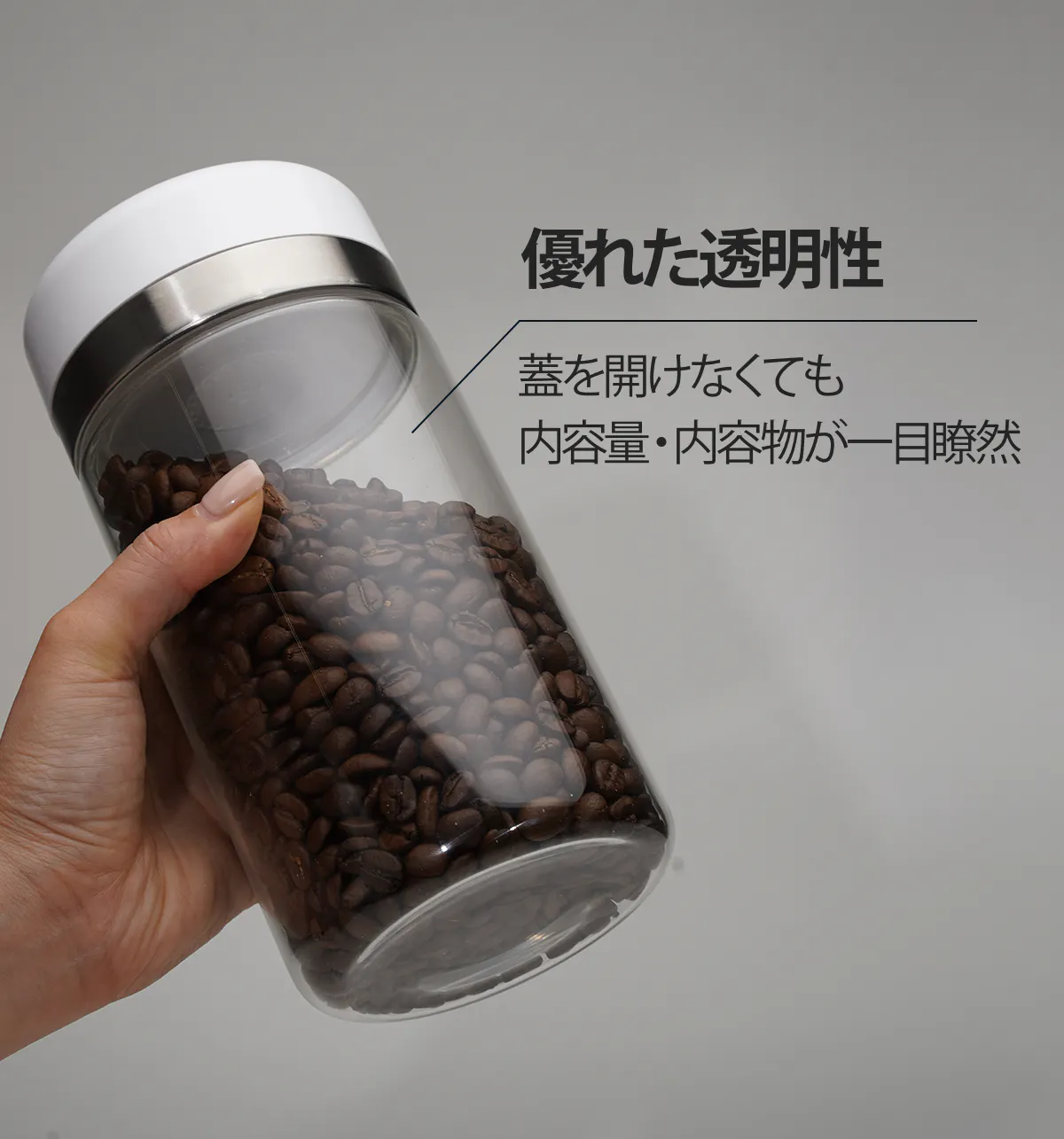 透明度の高い『スマートキャニスター』はコーヒー豆や食材がスッキリ鮮やかに見えて、ひと目で残量が見えるので、使いやすいくオシャレな空間にも馴染みます。