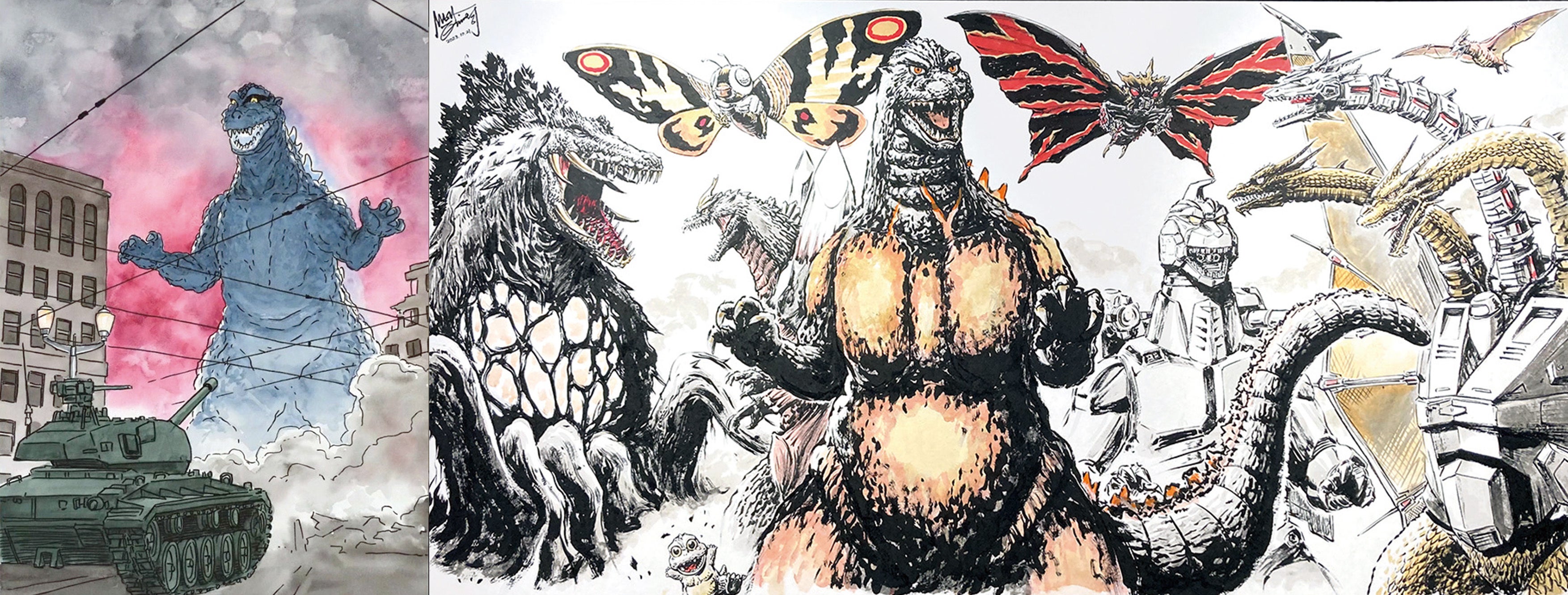 『GODZILLA GENERATION の逆襲』は東京凱旋企画です。舞台を京都から東京へと移して、 『ゴジラ』から『ゴジラ-1.0』まで全ての“ゴジラシリーズ”を描いてきたイラストレーター・漫画家の二人の作品でゴジラ70周年を記念した展示となります。展示セレクションのテーマは、“ゴジラ70th”と“キングギドラ60th”と“メカゴジラ50th”。ゴジラは『ゴジラ-1.0』描き下ろしなども含めた豪華なラインナップを予定。また、2021年に“ヘドラ50th”でスタートした怪獣周年企画もいよいよ4年目に突入。二大怪獣絵師が描いたキングギドラとメカゴジラ作品をセレクションしての展示となります。