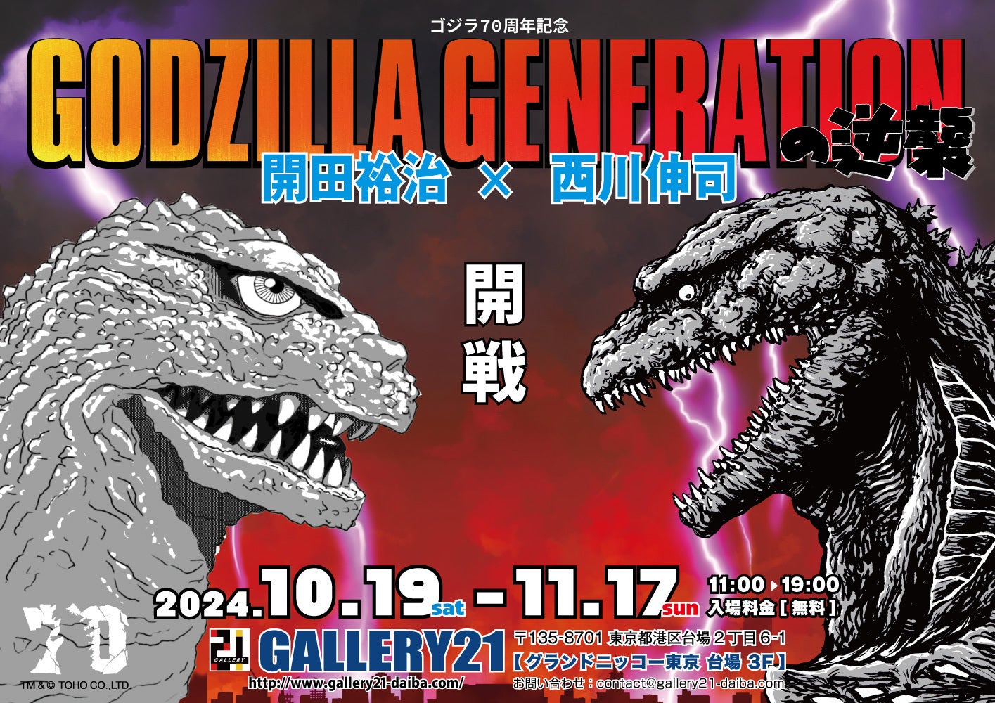 今回開催する企画『GODZILLA GENERATIONの逆襲 開田裕治×西川伸司』はその凱旋企画とも呼べる作品展です。 『ゴジラ』から『ゴジラ-1.0』まで全ての“ゴジラシリーズ”を描いてきたイラストレーター・漫画家の二人の作品を中心にゴジラ70周年を記念した展示展開となります。