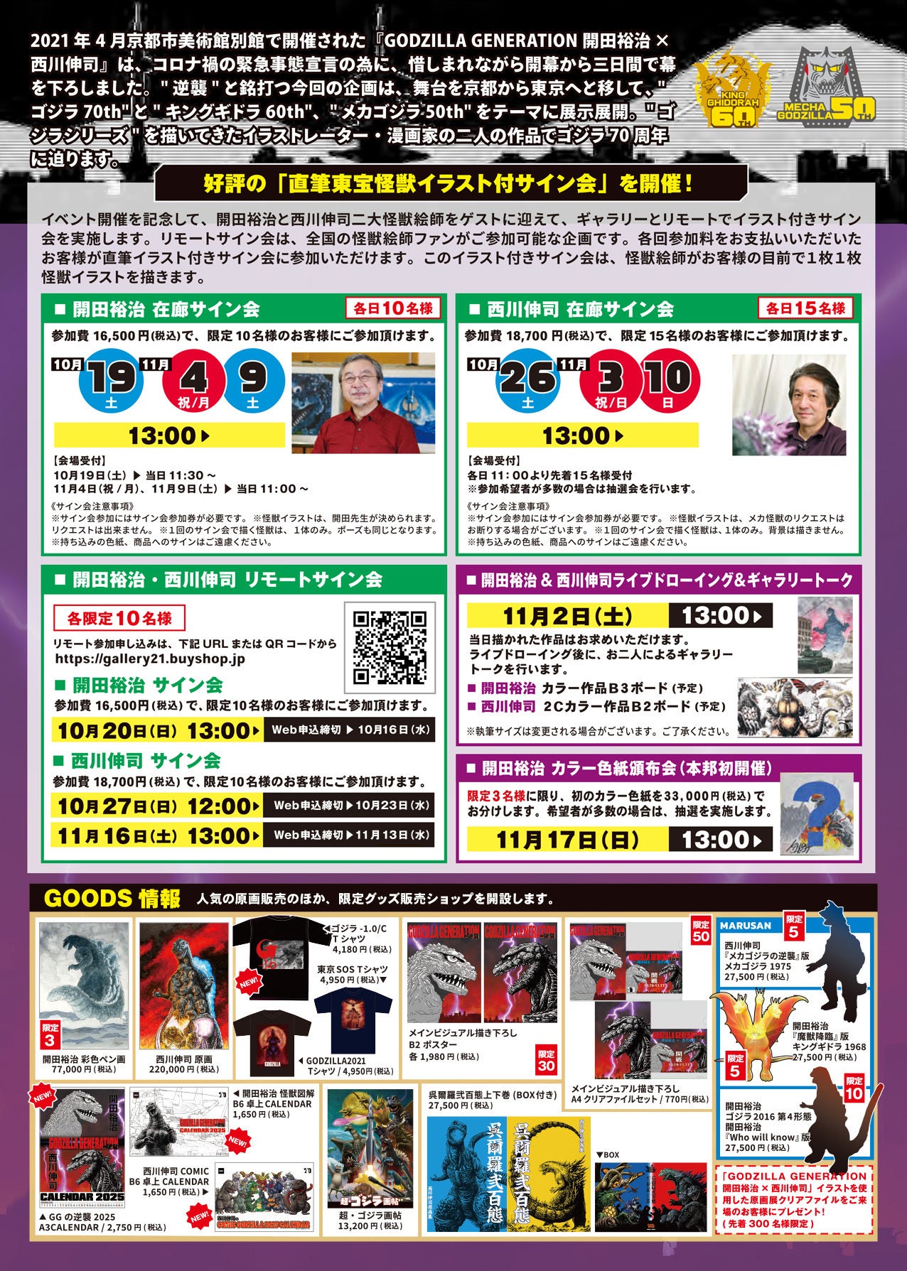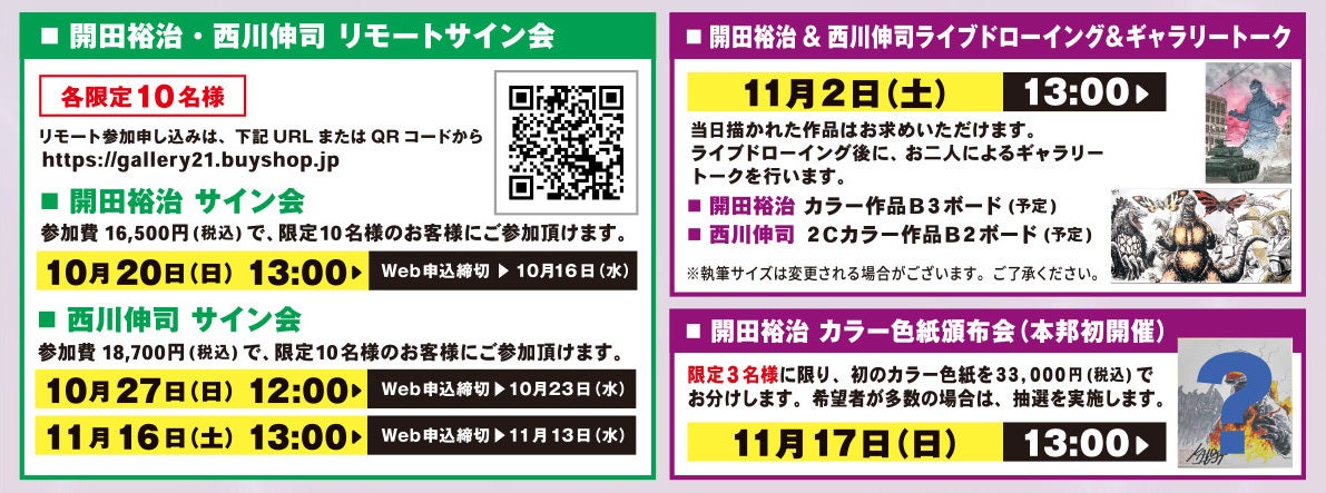 イベント開催を記念して、開田裕治と西川伸司二大怪獣絵師をゲストに迎えて、ギャラリーとリモートでイラスト付きサイン会を実施します。リモートサイン会は、全国の怪獣絵師ファンがご参加可能な企画です。Webでお申込ください。各回参加料をお支払いいただいたお客様が直筆イラスト付きサイン会に参加いただけます。