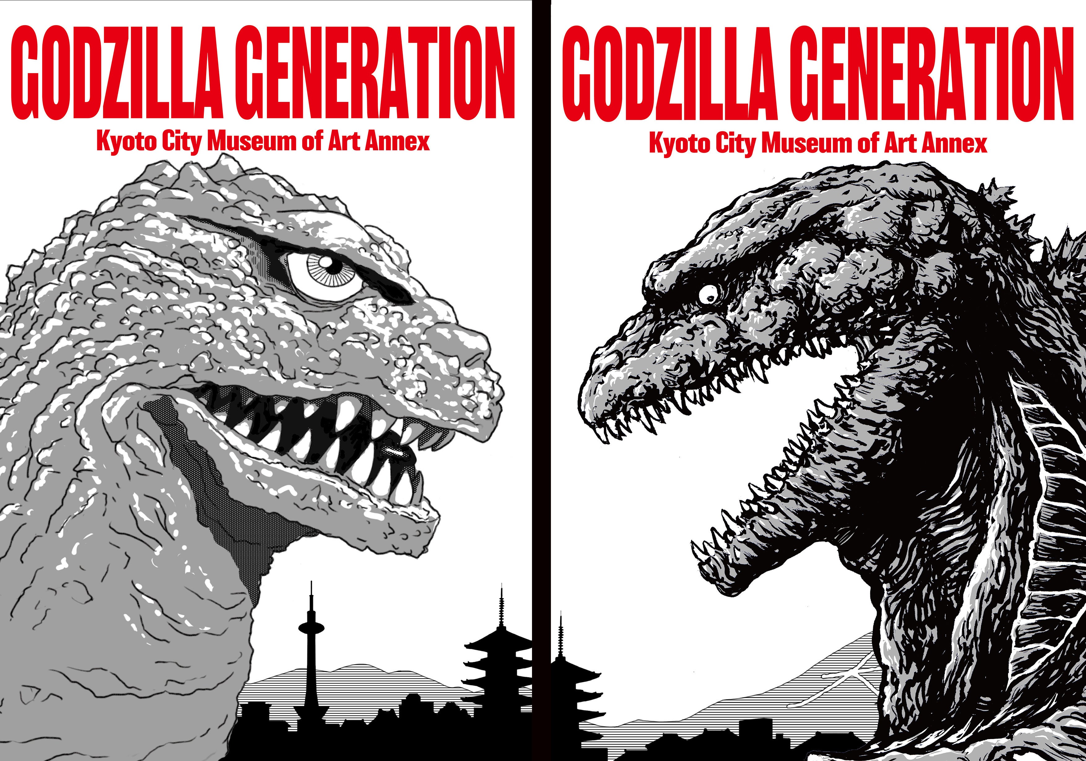 『GODZILLA GENERATION』では、京都の伝統工芸との連動を模索して、大学時代を京都で過ごした開田裕治氏、漫画家デビューで上京するまで京都で生まれ育った西川伸司氏と、京都に所縁の深いお二人には作品の展示以外にもメインビジュアルの開発をお願いしました。敢えてモノクロで描かれたメインビジュアルは、左から『キングコング対ゴジラ』のゴジラ1962と背景が開田裕治、右のゴジラ2016“シン・ゴジラ第4形態”が西川伸司による怒涛の共作でした!。