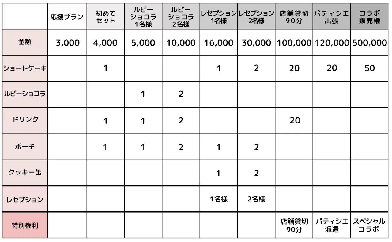 新商品のルビーショコラショートケーキはもちろん、初めての方用の限定ケーキセットやレセプションパーティーへのご招待券、貸切権、出張パティシエ、コラボ権など、応援してくださった皆様に特別な感謝の気持ちを込めてお届けします。