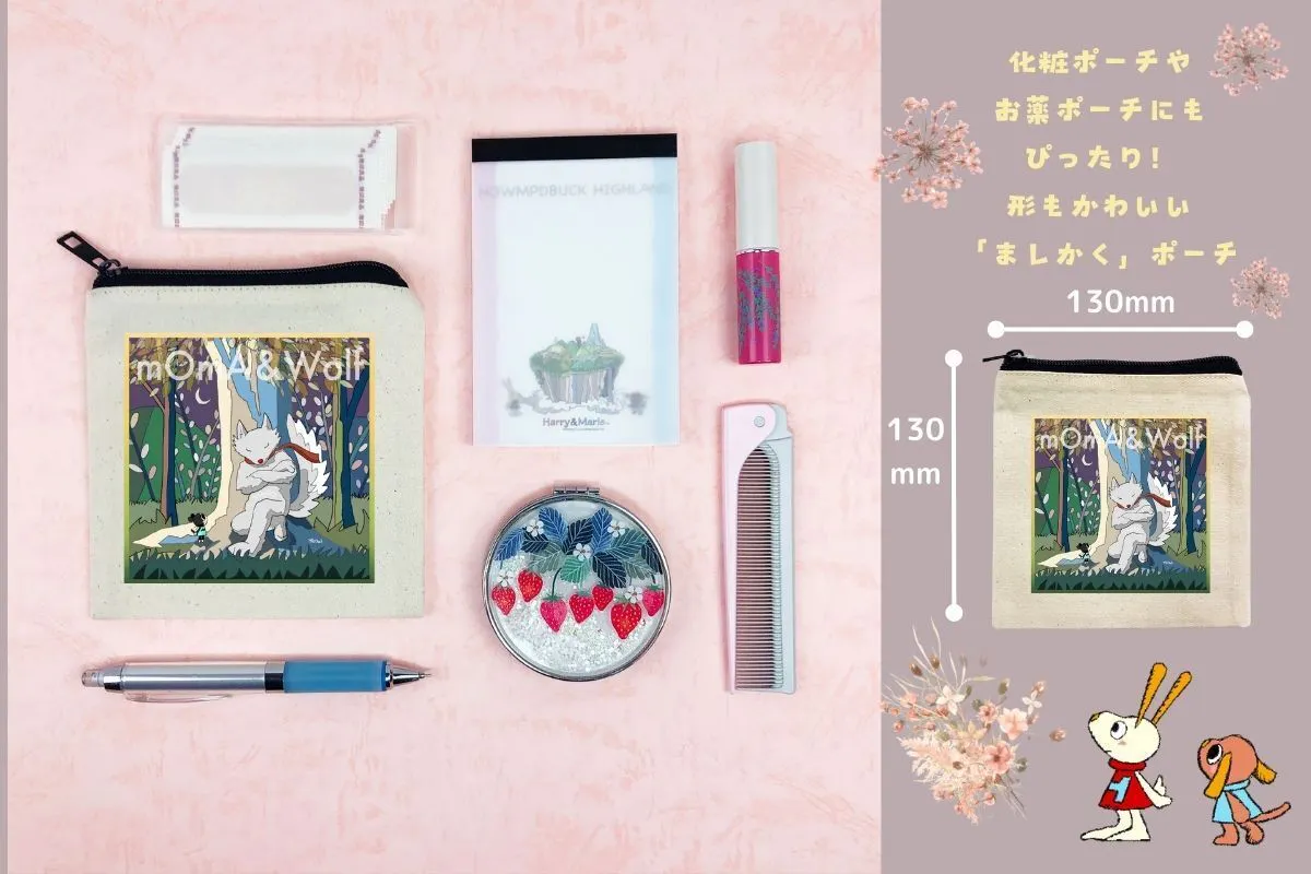 モマちゃんがウォルフさんのモノマネをしているイラストが刺繍でかわいくはいったマルチケースです。