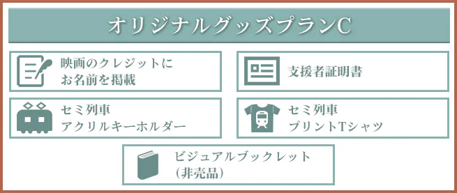 映画本編に登場する「セミ列車」をデザインしたアクリルキーホルダーとTシャツが付随するプランです。