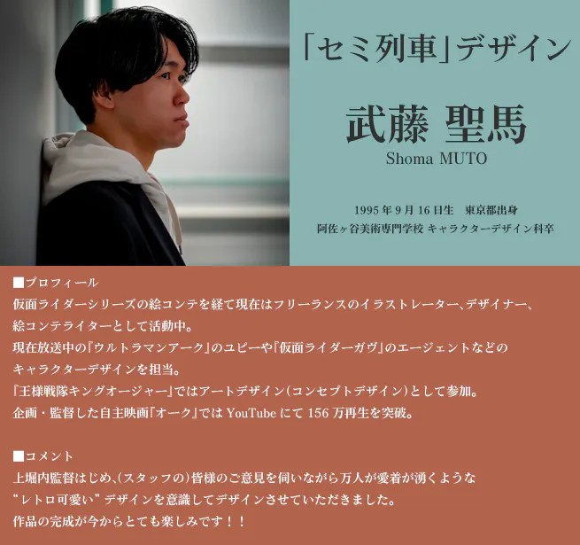 そして、本作のシンボルであり舞台となる「セミ列車」のデザインは、これまでデザイナーとして『仮面ライダー』シリーズや『王様戦隊キングオージャー』に携わってきた武藤聖馬氏が手掛けています。