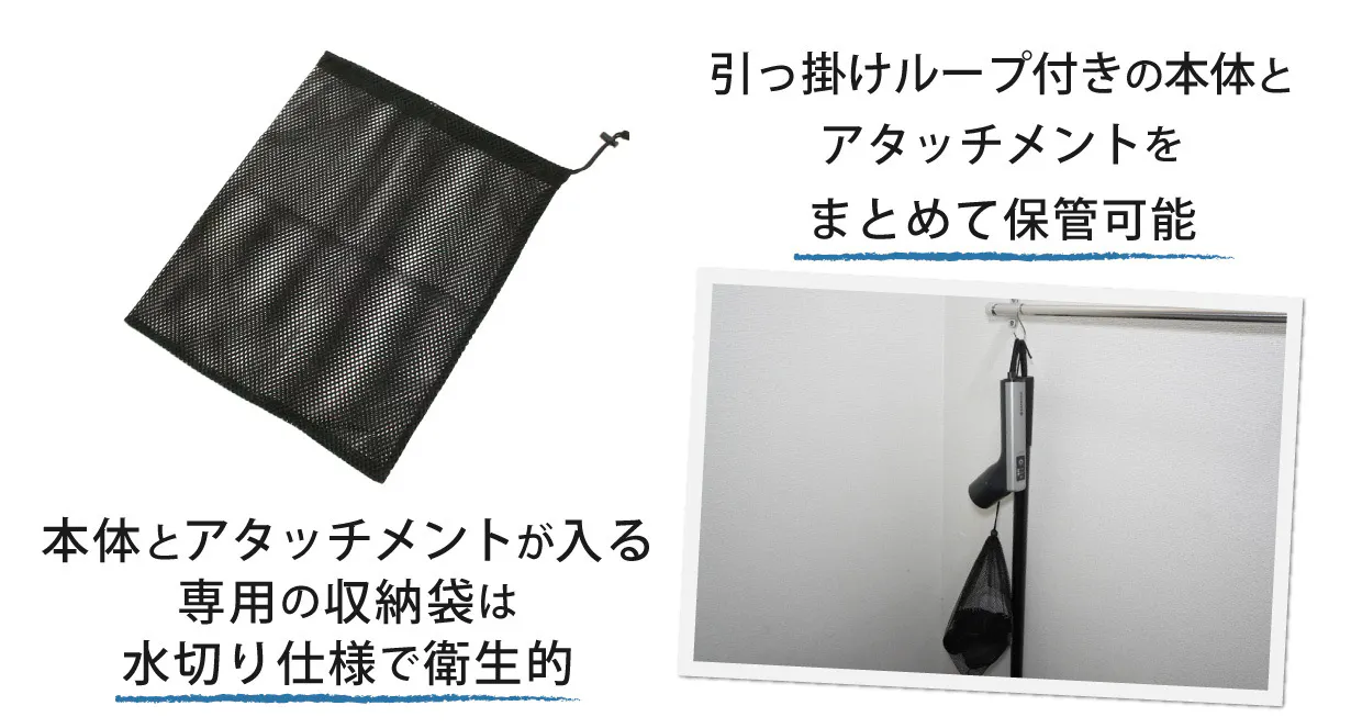 また皆さまの作業が捗るよう、本体・アタッチメントを一緒に保管・持ち運びできるメッシュポーチもご用意いたしました! ブラシを乾かすときにも便利な仕様になっています。