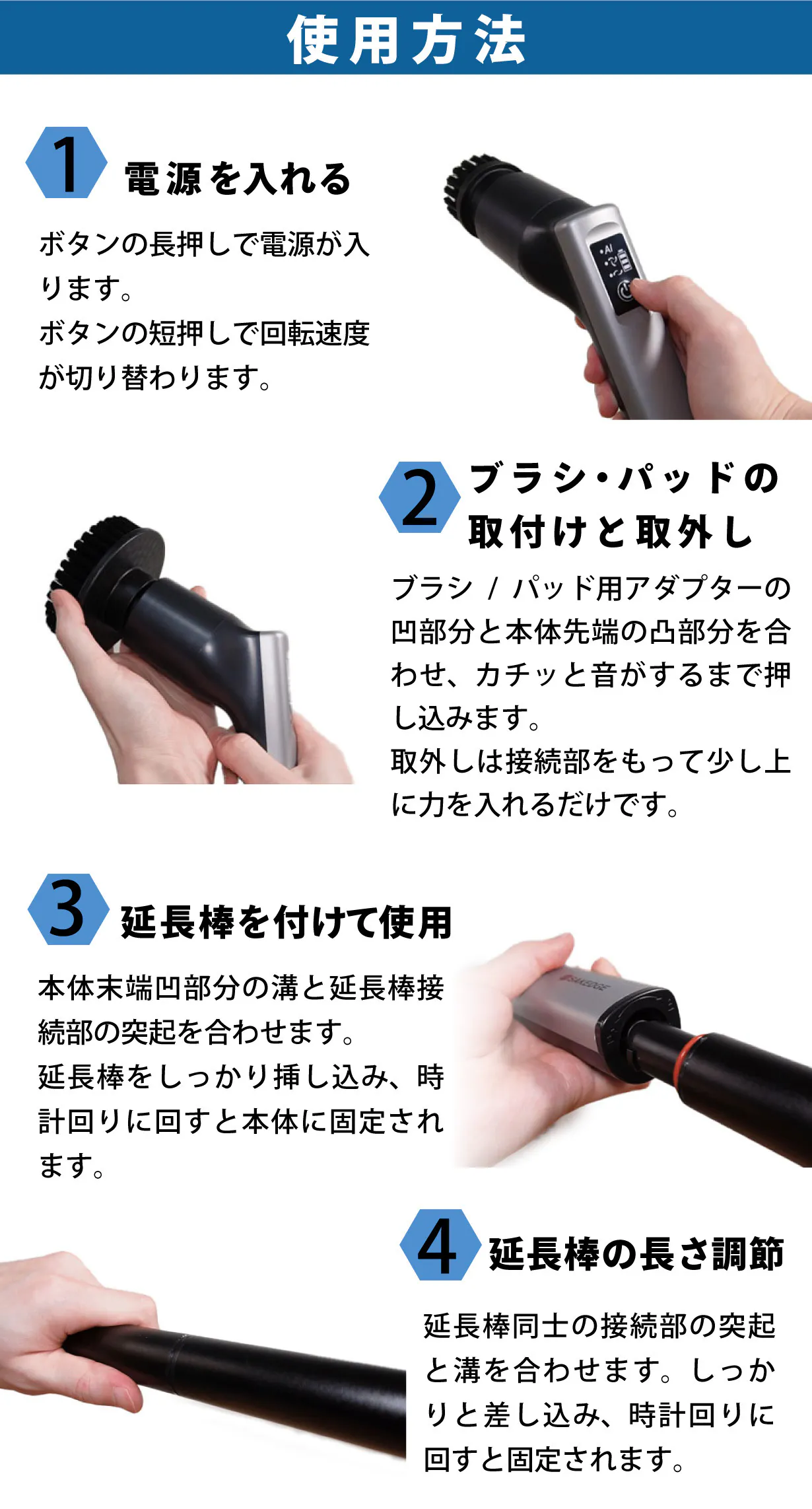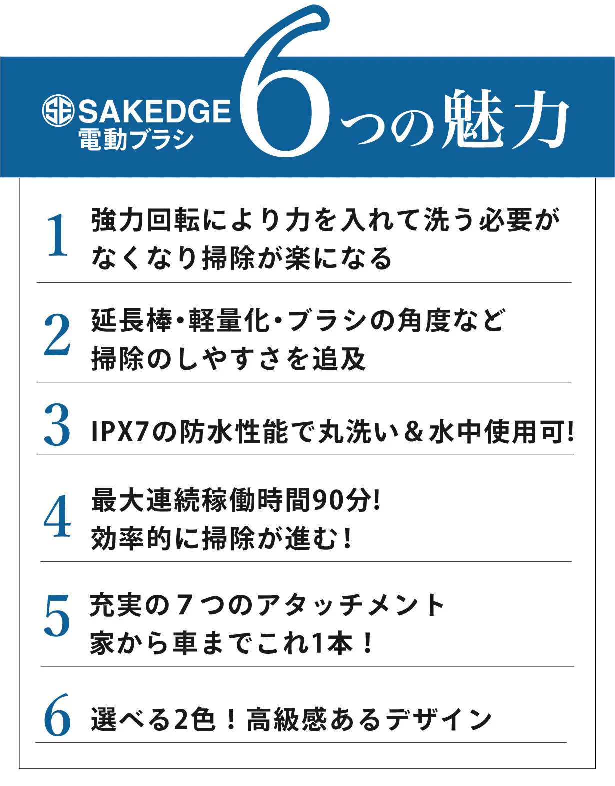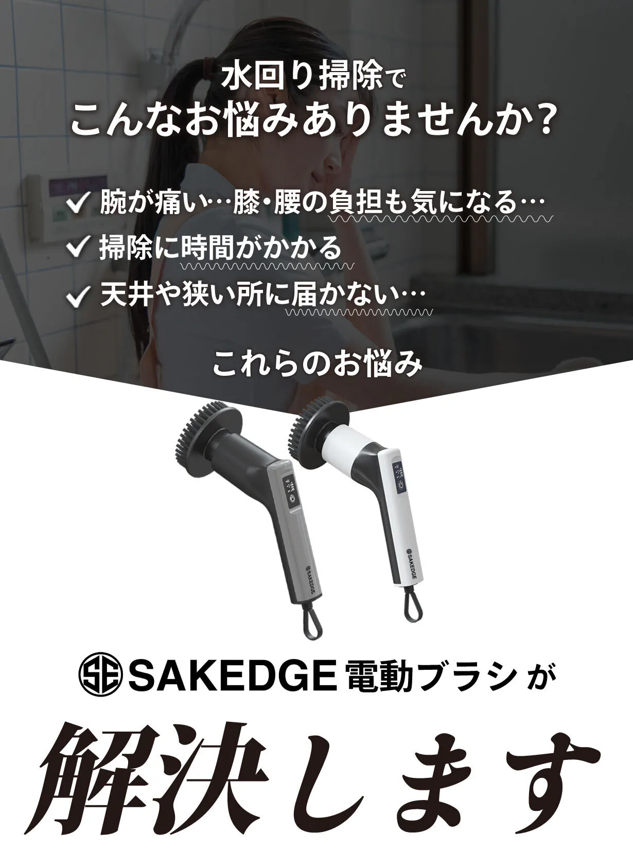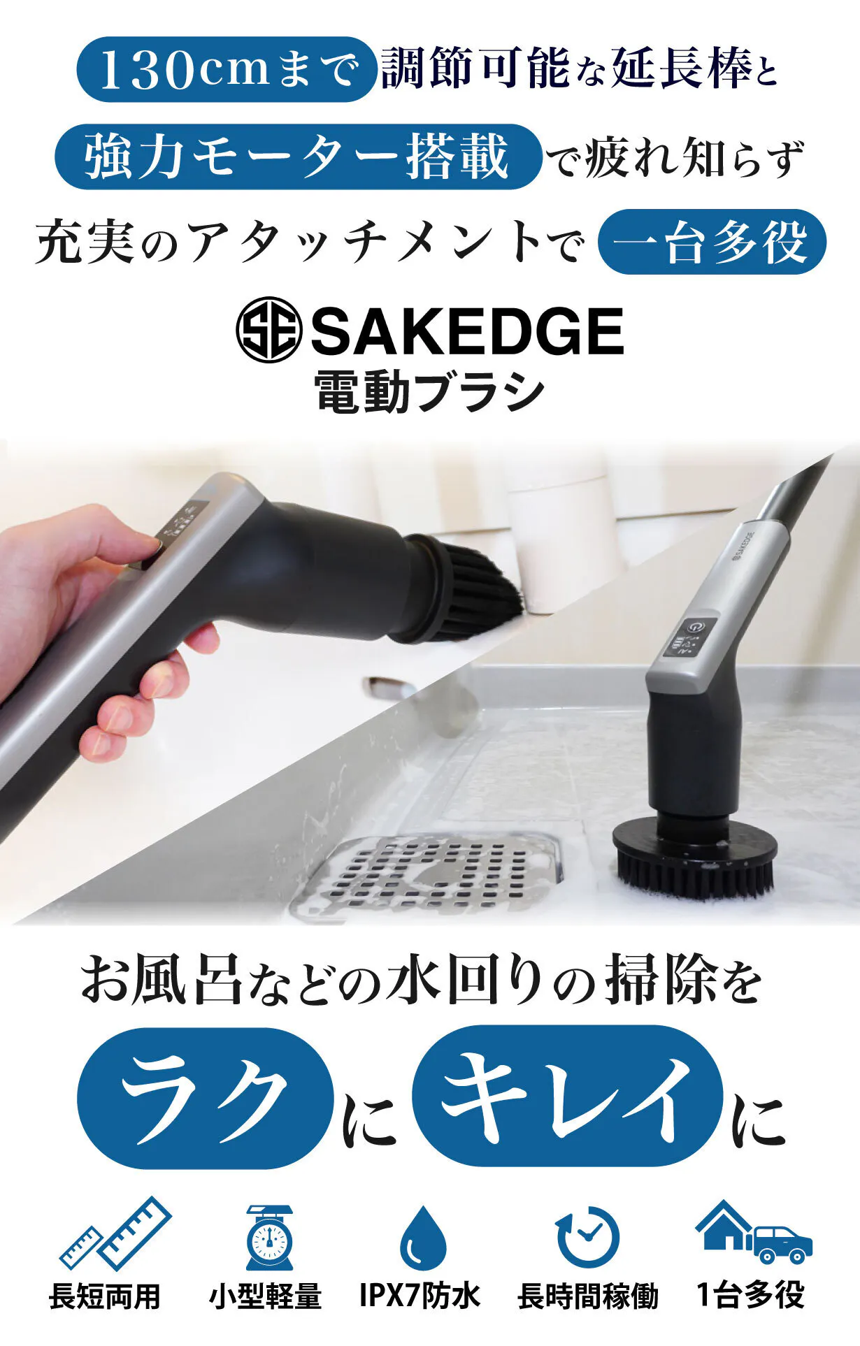 今回お届けする「SAKEDGE 電動クリーナー」は、お風呂などの水回り掃除や、大きく掃除しにくい窓の掃除、玄関やデッキの床掃除、洗車などが簡単に出来る製品を探し求め出来上がった商品です。