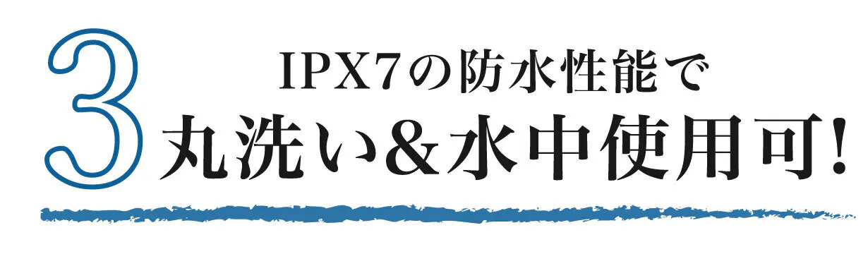 IPX7とは、常温の水道水(静水)の水深1mのところに機器を沈め、約30分間放置して取り出したときに、機器の機能が動作する事を意味します。