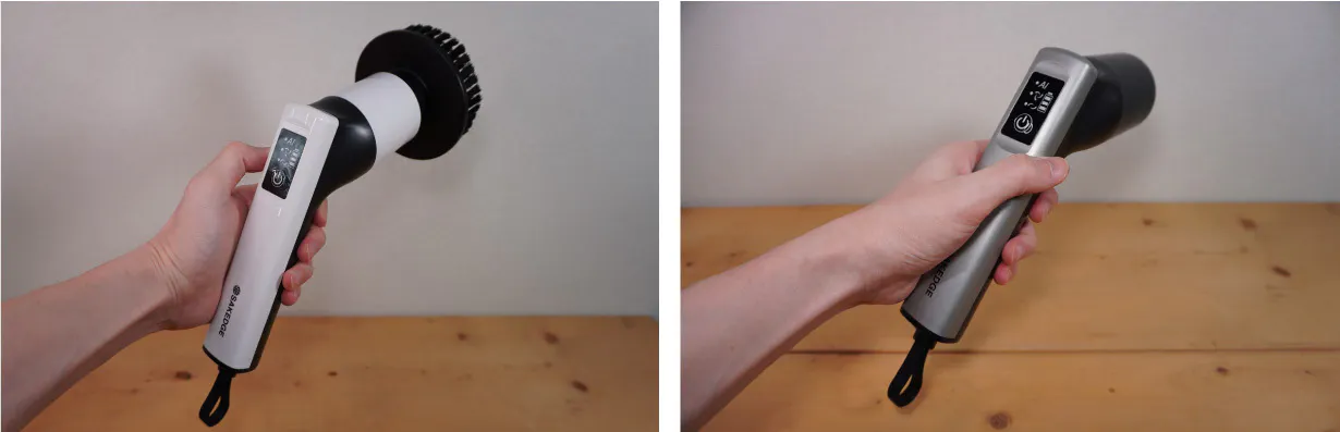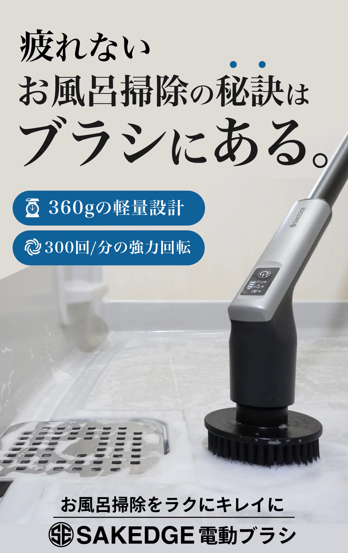 SAKEDGE電動ブラシは、ゴシゴシ力を入れて負担を感じていたお風呂掃除・頑固な油汚れ・水回りの汚れ落としを効率的に行えるよう、最大回転数300回毎分、最大トルク2.6N⋅mの設計となっています。