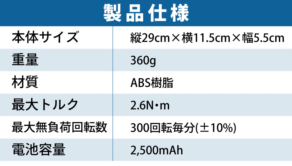 高速モードは300RPM、トルク2.6N⋅mで強力回転。