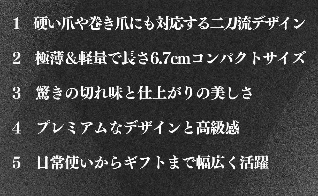 従来の爪切りとは一線を画す、シャープで精密な切れ味が特徴です。