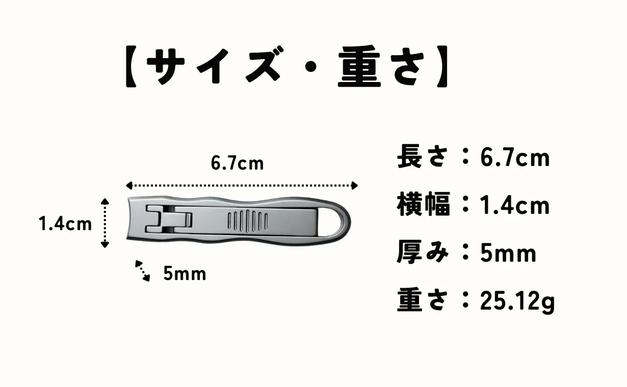 この爪切りは長さ6.7cm、厚さわずか5mm、重さたったの25gと超軽量かつコンパクト。