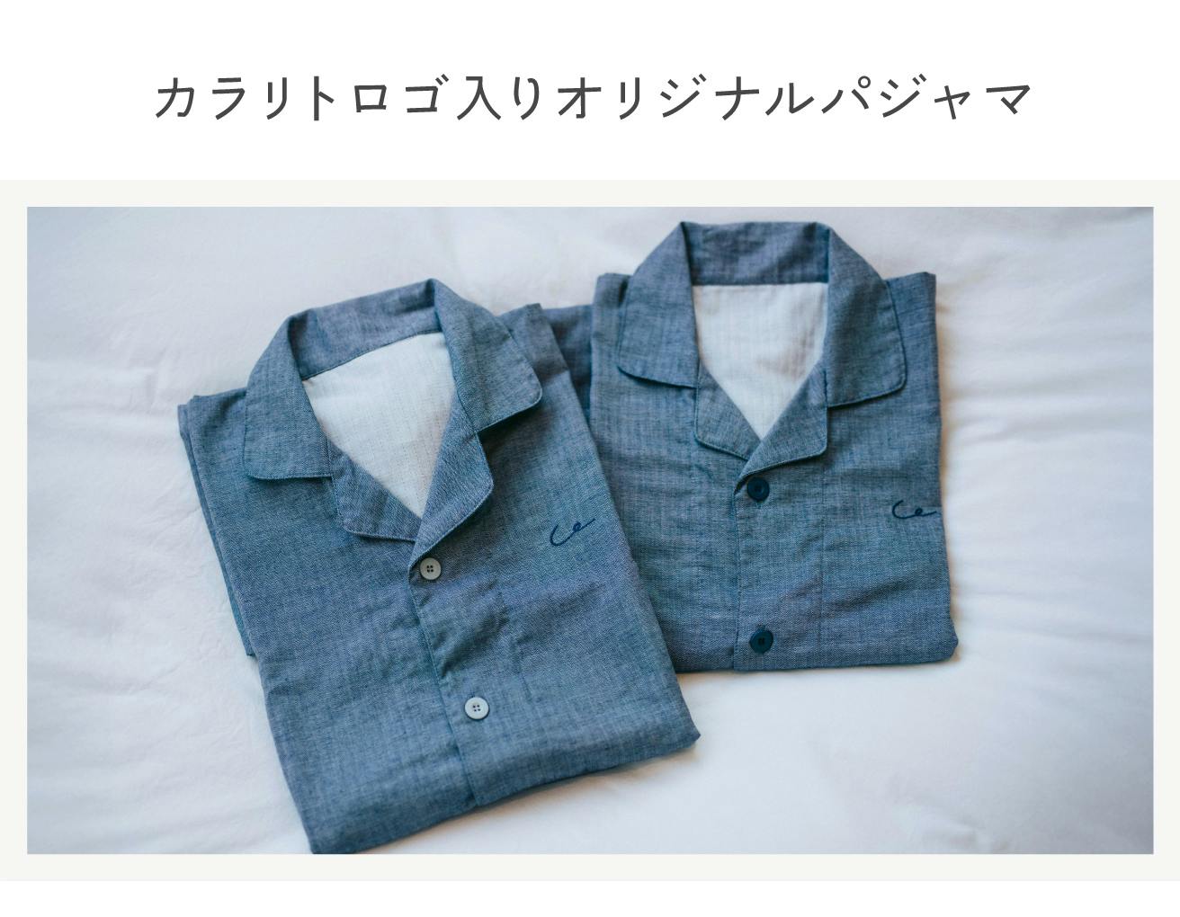 ダブルコットンとデニム生地を合わせてつくった、カラリトのロゴ入りオリジナルパジャマ。