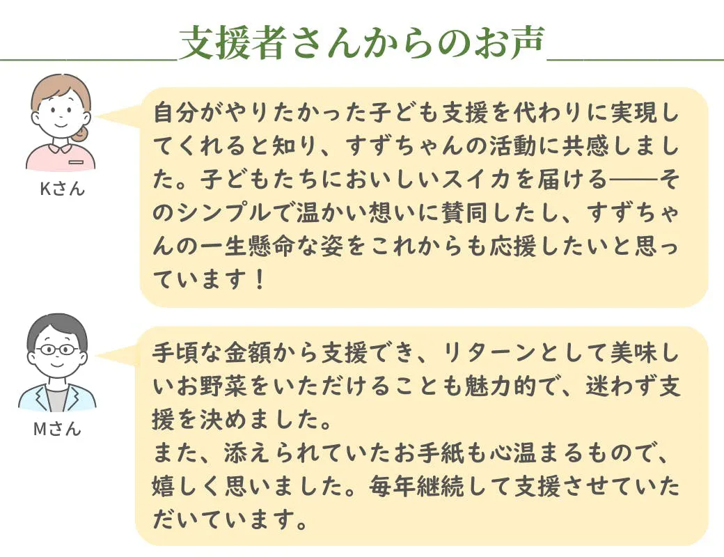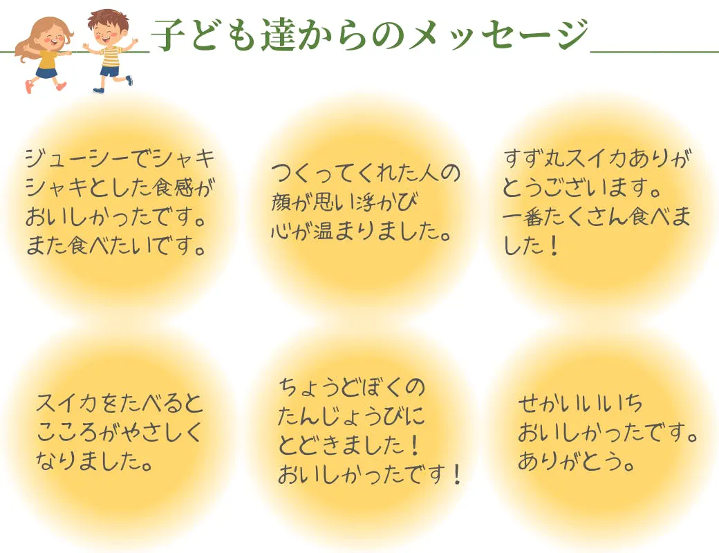2026/01/08 13:38明けましておめでとうございます!今年も宜しくお願いします!先日、チンゲン菜の発送をもって無事全てのリターンのお届けが完了いたしました!昨年はプロジェクト4年目、最多人数&最多支援(スイカ100玉相当)をいただき、多くの子ども達及び職員の方々へお届けすることができました。施設さんからの寄せ書きはこちら(ログインするとご覧になれます。)「スイカが好きになった!」「大きくなったらスイカを作ってみたい!」そんな声まで飛び出し、私自身も胸が熱くなりました。 一つひとつのご支援が、子ども達の新しい「好き」や「挑戦」のきっかけになっています。本当にありがとうございます。この活動がこれからも、農業や食に興味をもつきっかけの1つになれると嬉しいです。今年も!子ども達が笑顔になれる取り組みを続けてまいりますので、引き続き応援いただけますと大変大変ありがたいです。今後ともよろしくお願いいたします!すず丸スイカ 前田すず香 もっと見る子ども達からの寄せ書き&お手紙