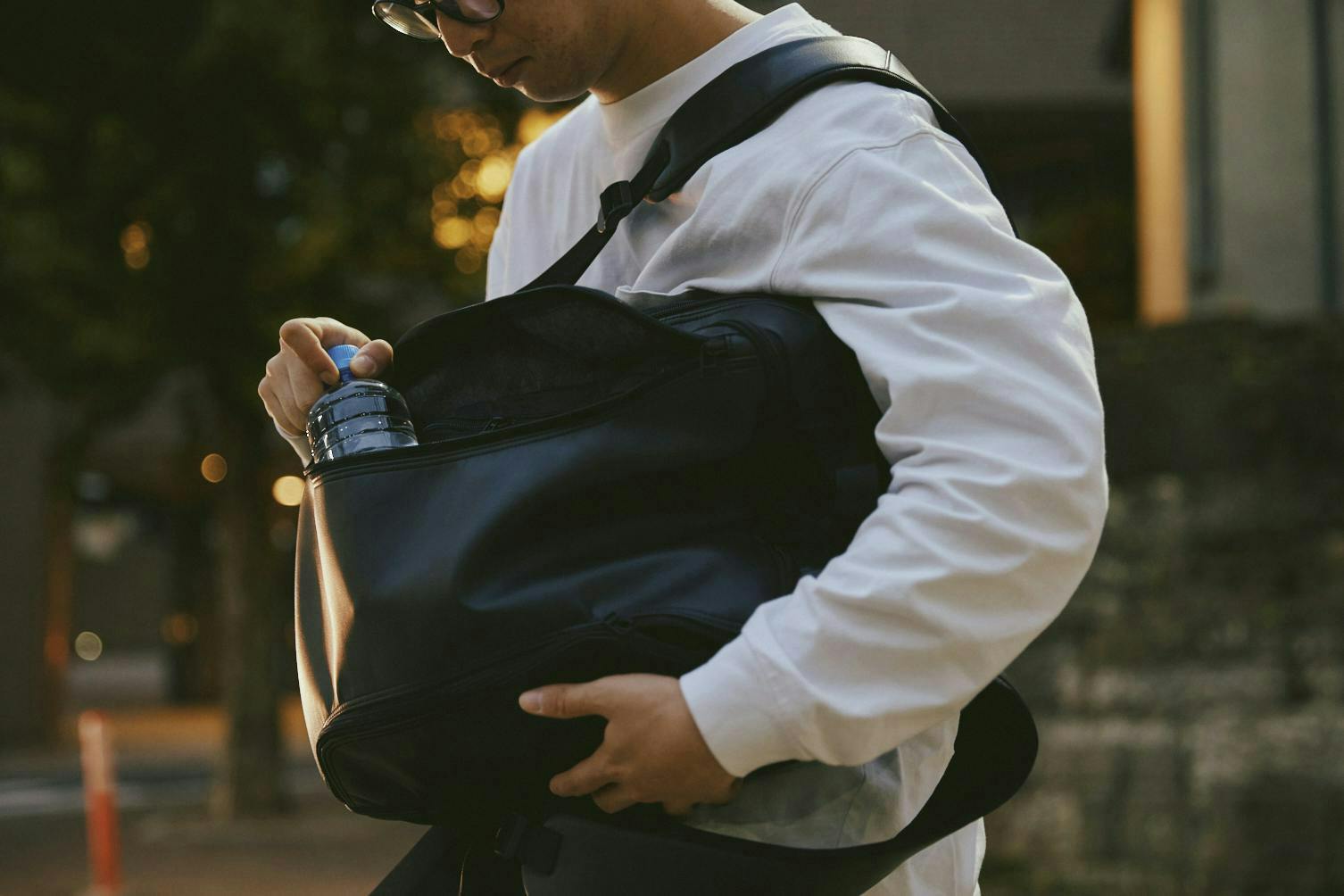さらに、左右どちらかのファスナーを開けてアクセスできる正面の収納部は、スニーカーやカメラなども難なく入る大容量。会社帰りのジム通いや、機材を持参する撮影などのシーンにも重宝します。