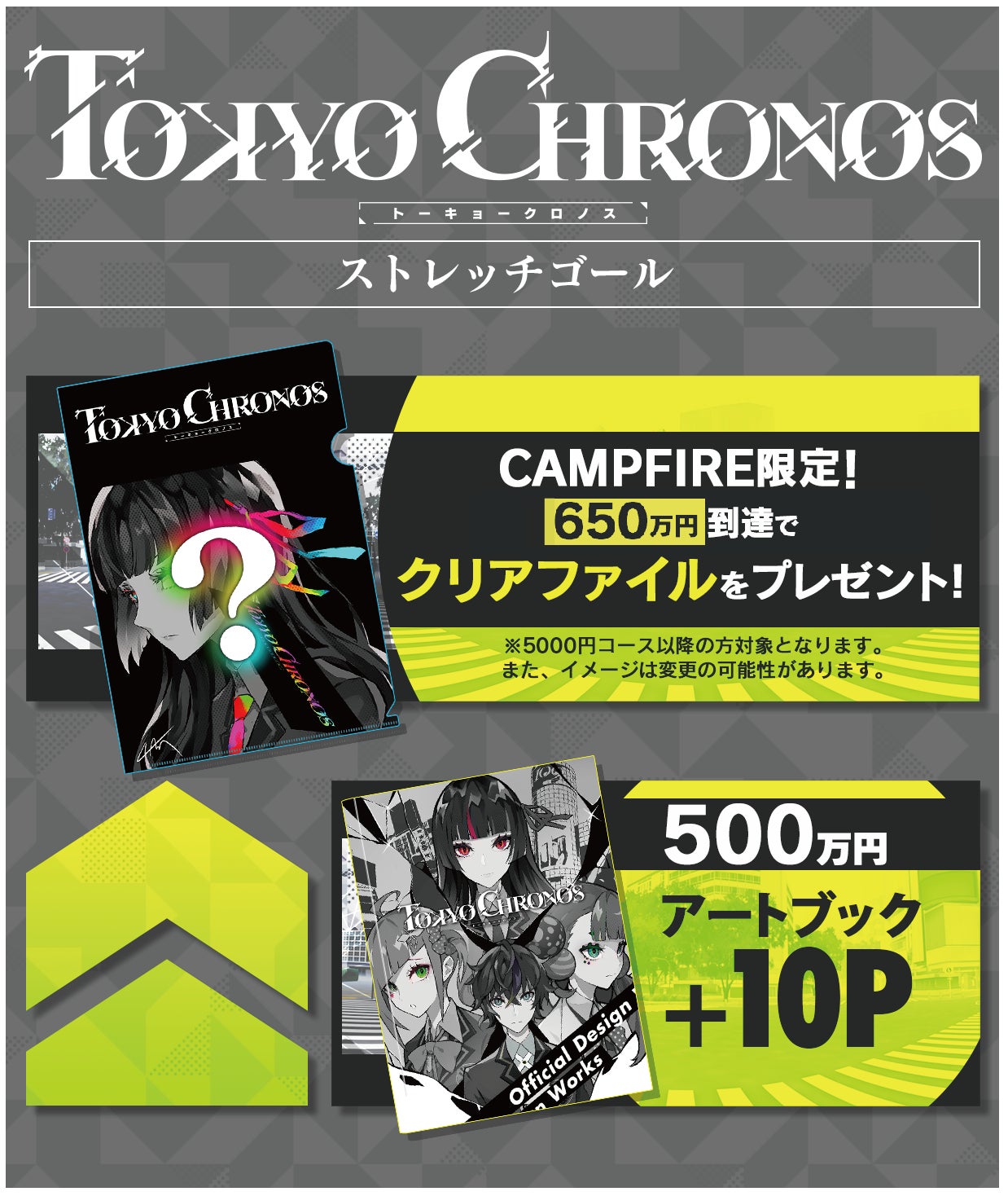 だからこそ、支援者の皆さまには、開発過程を共有しつつ、時にアイディアを募ったり、国内スペシャルイベント企画したりするなど様々な形で作品と関わっていただき、ともにこの作品を育て上げ、「東京クロノス」を全世界に羽ばたかせる、いわゆる「社外クリエイター」「社外宣伝P(プロデューサー)」としての役割を担って頂きたい。