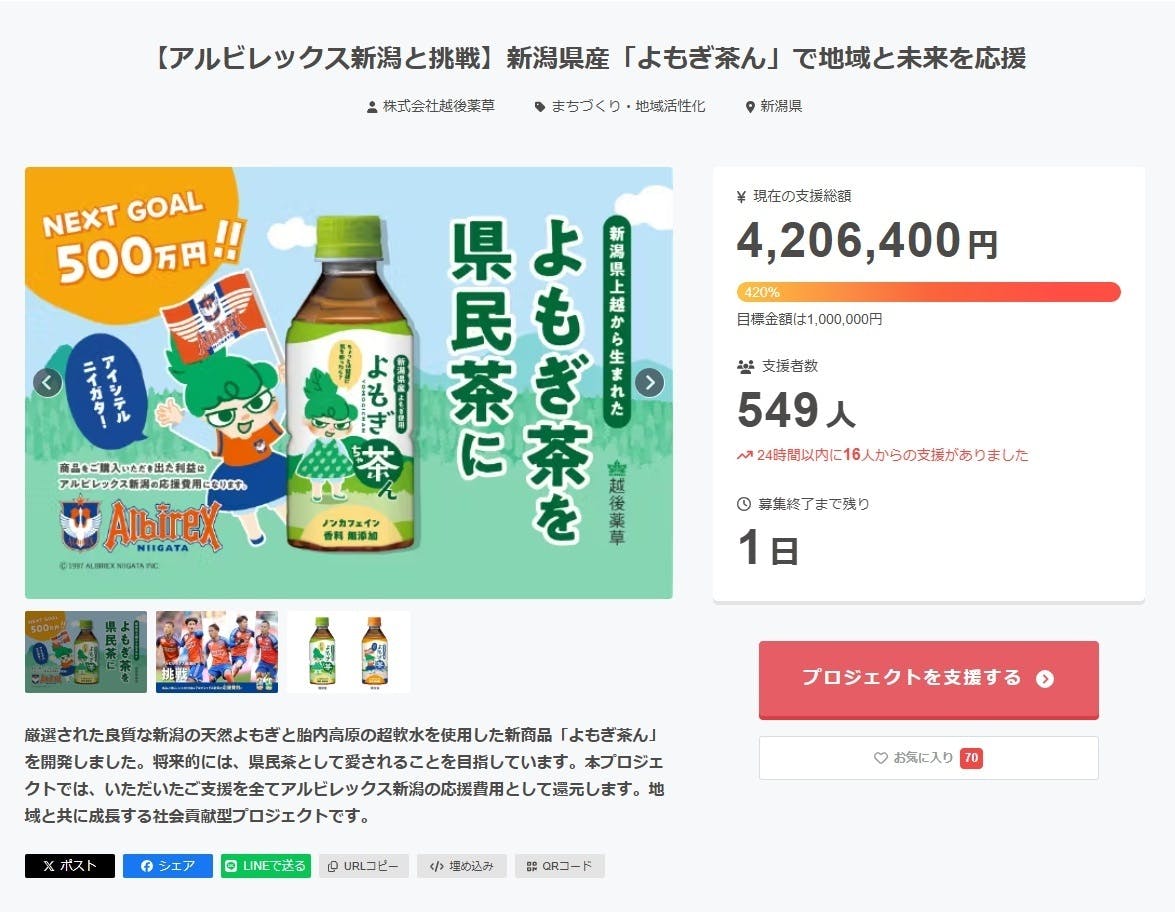 さらに多くの方に「よもぎ茶ん」をお届けし、アルビレックス新潟のサポーターの皆さまと共に新潟を盛り上げていくため、NEXT GOAL 300万円を設定いたしました。