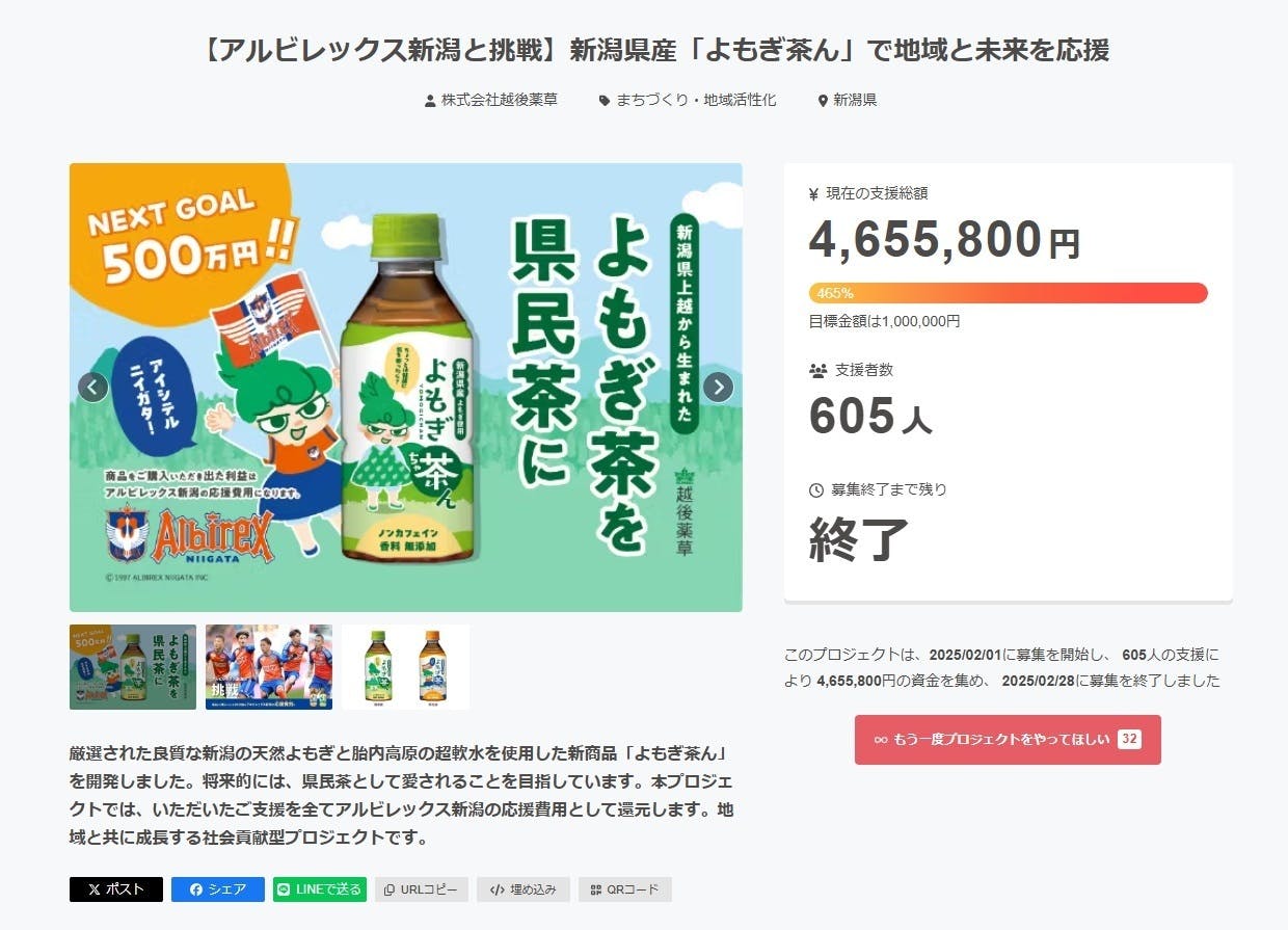 2025/03/03 09:38皆さまの温かいご支援のおかげで、本プロジェクトは 目標達成率465%、総支援額4,655,800円、支援者数605名という当初の目標を大きく超える成果を収め、無事に終了いたしました!たくさんの応援メッセージやご支援をいただき、誠にありがとうございます。ご支援いただいた皆様のおかげです。改めて感謝申し上げます。【リターンの発送について】3月からリターンを順次発送しており、すべてのお客様のお手元に商品をお届けできる予定です。万全を期しておりますが、万が一トラブルなどにより遅延が発生した場合は、活動報告にて随時ご連絡させていただきます。このプロジェクトをきっかけに、「よもぎ茶ん」が新潟の皆さまに愛される県民茶となるよう、これからも全力で取り組んでまいります!今後とも応援のほどよろしくお願いいたします! もっと見る