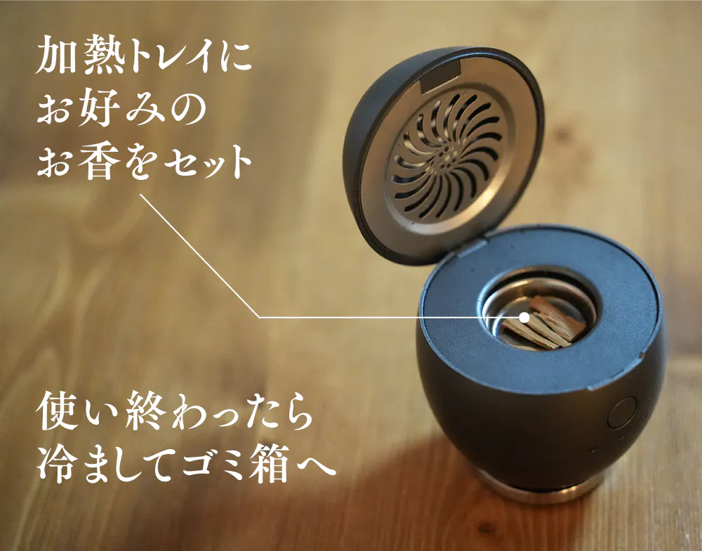 火を使わずにお香を楽しめる、お香をもっと気軽に生活に取り入れる、香りを手軽に楽しめるアイテム Orbby をみなさまにお届けいたします。