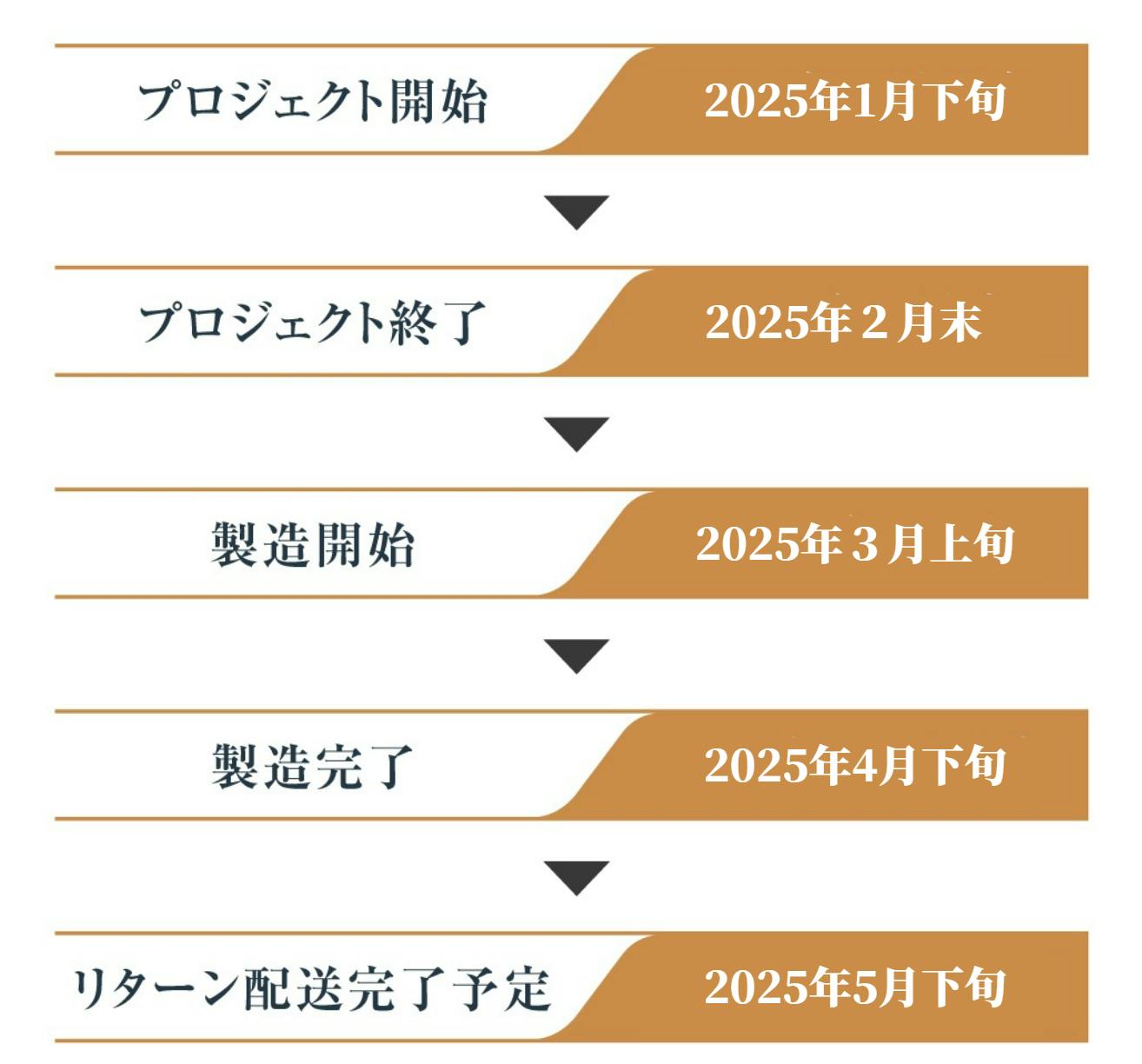 ※本文中に記載させていただいたスケジュールは、あくまでプロジェクト公開時点の予定です。クラウドファンディングの性質上、配送遅延のおそれがございます。原則として、配送遅延に伴う支援のキャンセルはできませんが、リターン配送予定月から3ヵ月を超えた場合には、希望者に限りキャンセルにて対応させていただきます。
