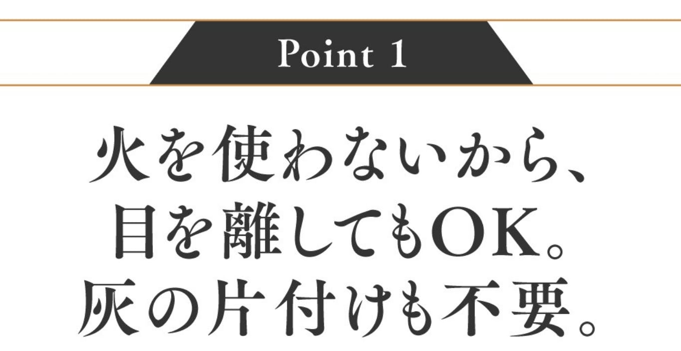 Orbby なら、いつでも電源オン・オフができて、三段階の温度調整機能付き。火を使わないから、灰などの片付けのわずらわしさからも解放されます。