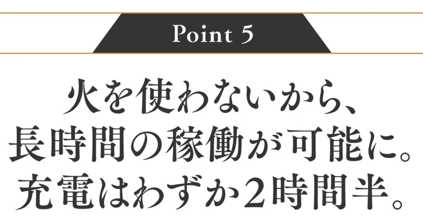 A4. ワイヤレスでご使用の場合、120℃で約2.5時間、150℃で約2時間、180℃で約1.5時間後に充電が切れます。充電コード接続の場合は、それ以上の時間使い続けることが可能です。(過熱を防ぐオートオフ機能付きで、6時間後に電源が切れ、充電モードになります)