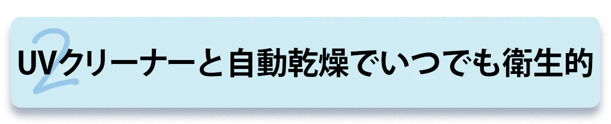 ブラシを乾燥させると新鮮な状態が保たれますが、バクテリアなどの微生物がブラシ上で増殖する可能性があります。それを防ぐために、医療グレードのUV-C紫外線除菌がケース内に取り付けられ、ケースにしまうとブラシをUVクリーナーで清潔に保ちます。