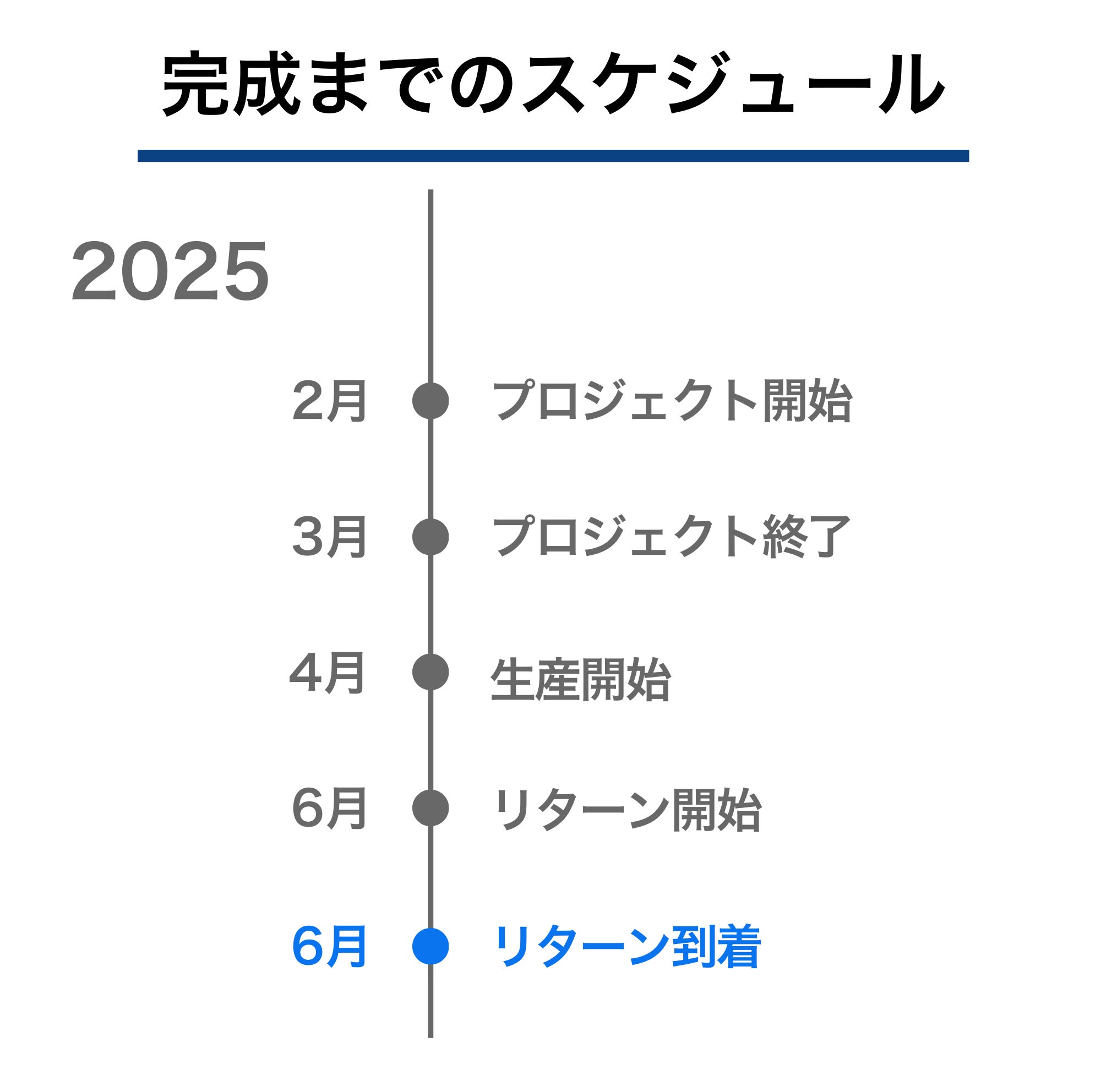 ※本文中に記載させていただいたスケジュールは、あくまでプロジェクト公開時点の予定です。クラウドファンディングを経て輸入を行う性質上、配送遅延のおそれがございます。