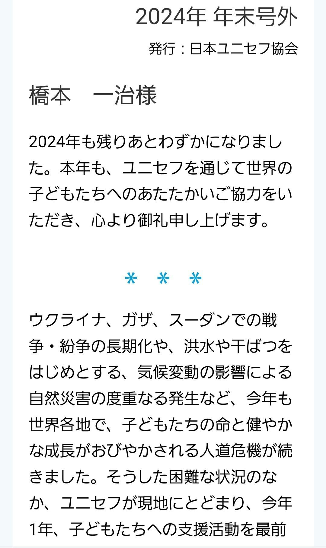 2024/12/30 07:30皆様こんばんは。任意団体NPO スマイルラッシュでは、ユニセフを通じて、世界の子どもたちを今後も支援活動を続けていく予定です。小さな力も集まれば大きな力となり、未来のある子どもたちへのほんの少しでも手助けになれば、、、温かい心を世界中に届けていきたいと思います。橋本 一治#任意団体NPOスマイルラッシュ#支援活動#群馬県#桐生市#日本ユニセフ協会 もっと見る