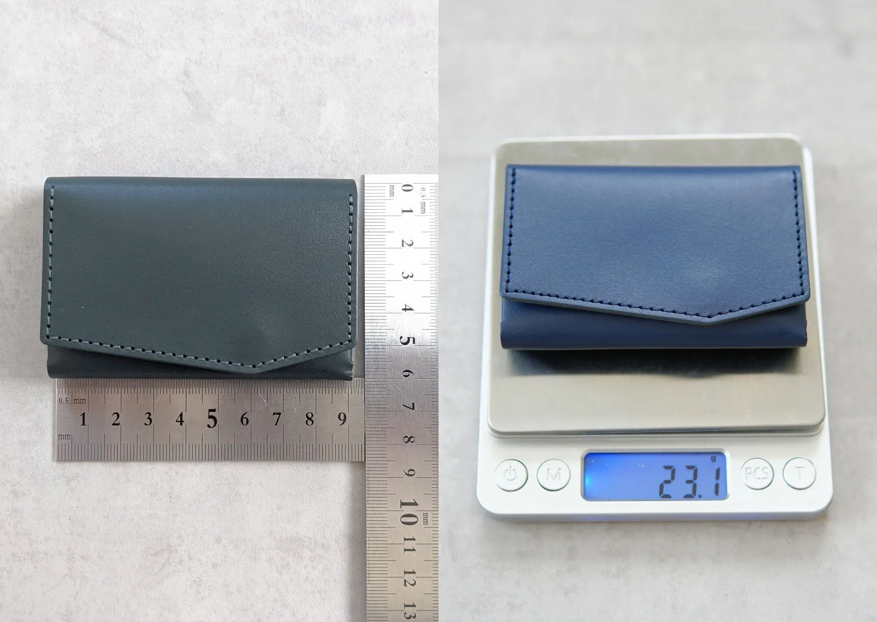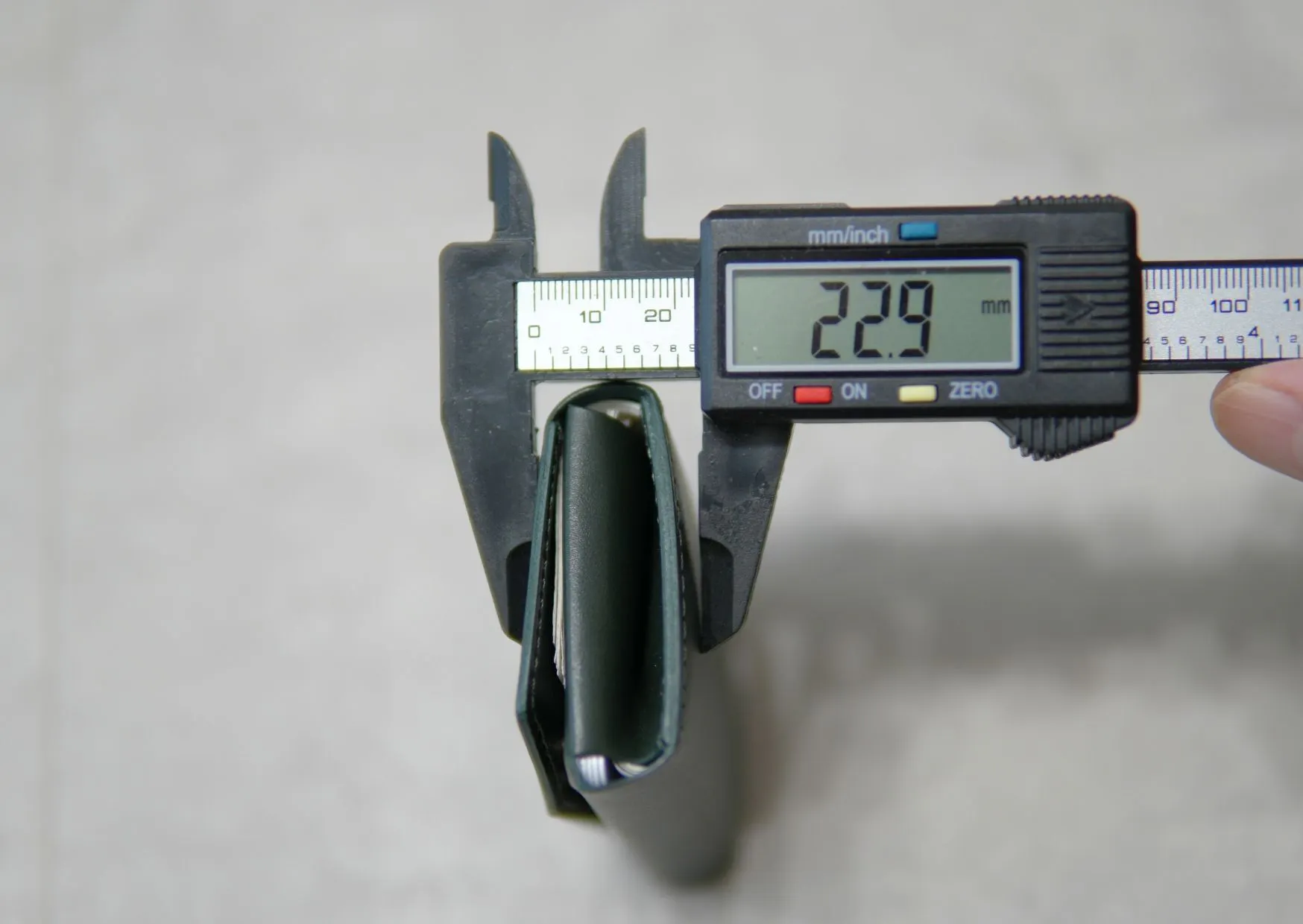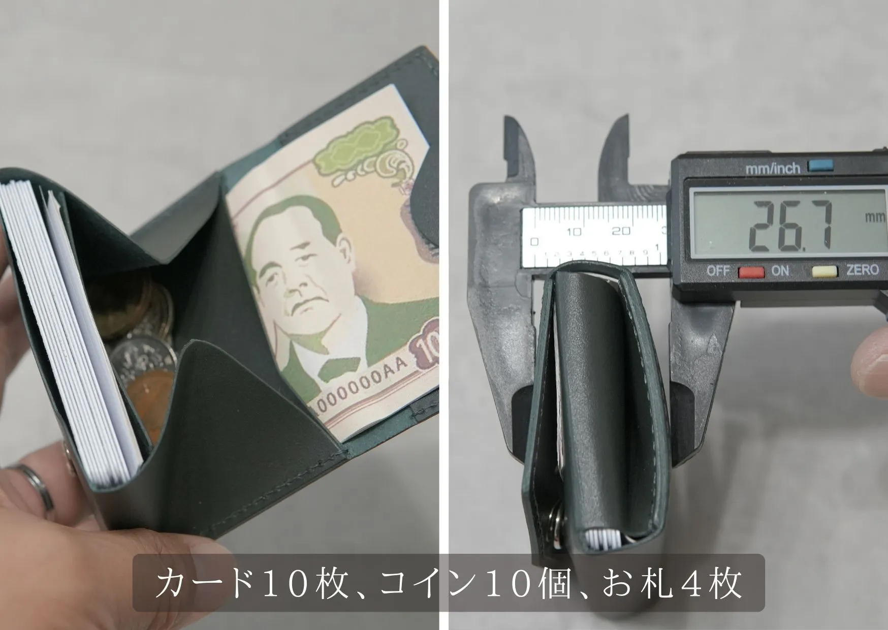 推奨容量のカード5枚、コイン12枚、お札10枚を入れて厚みは23mmほどです。こんなに小さいのに十分な容量を確保しました。