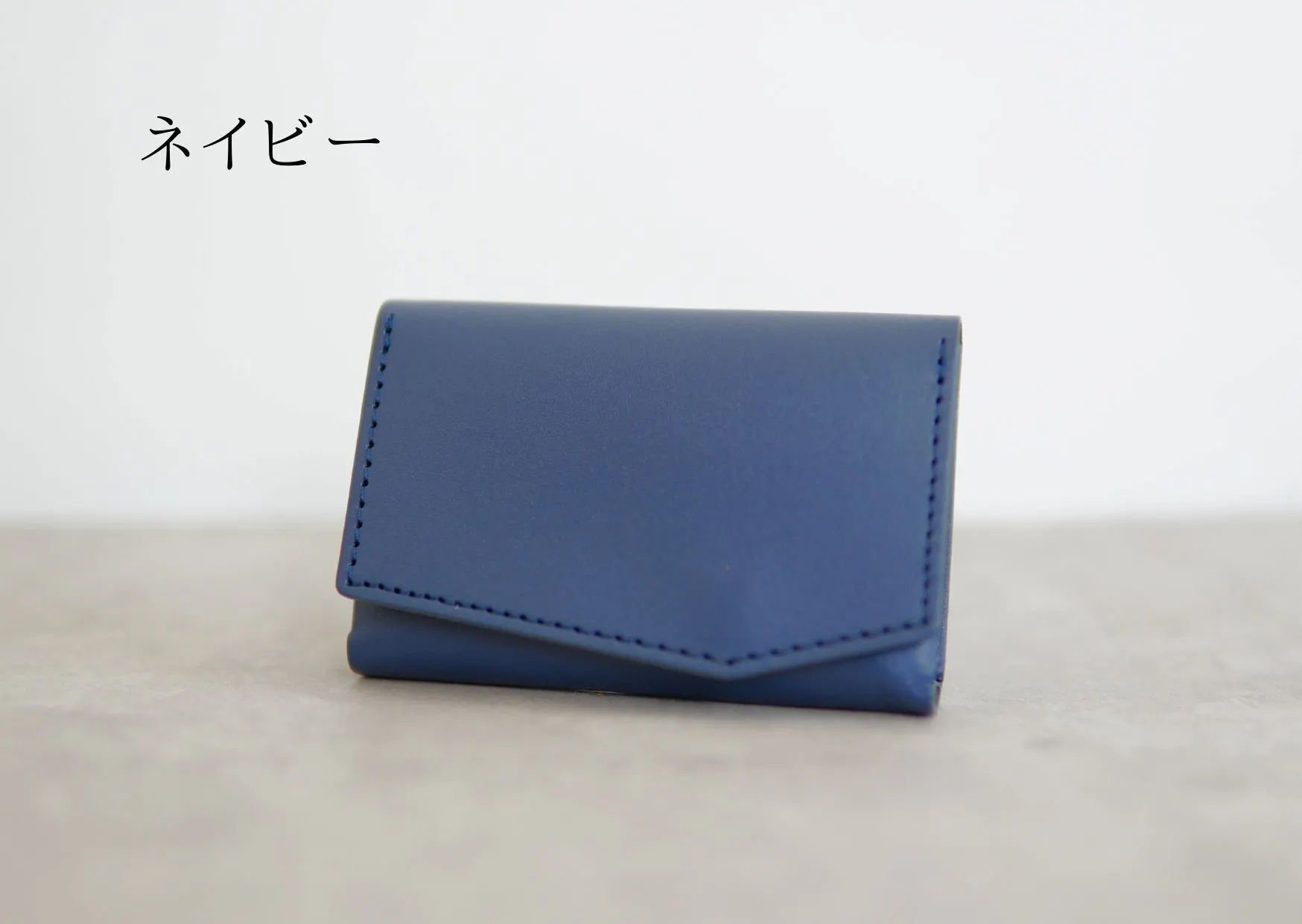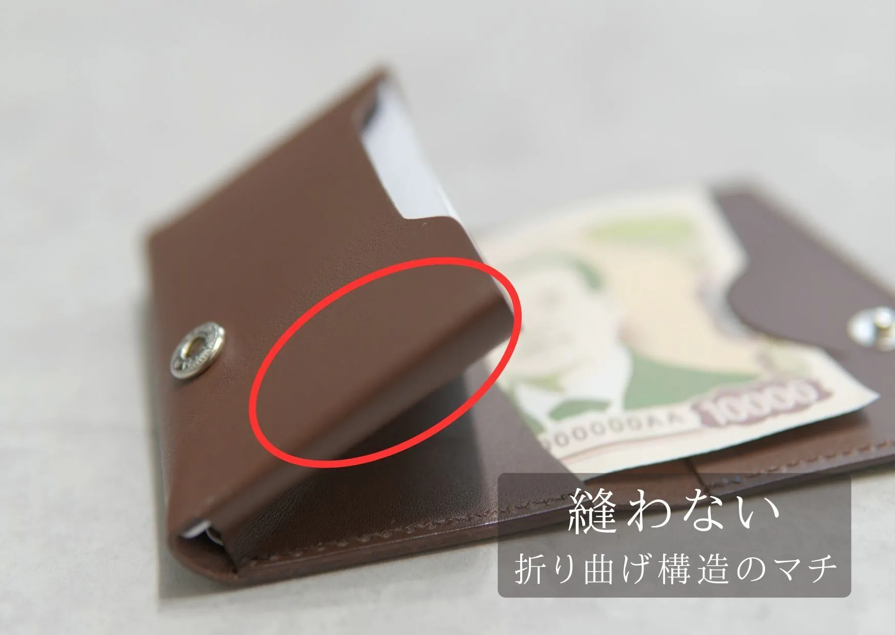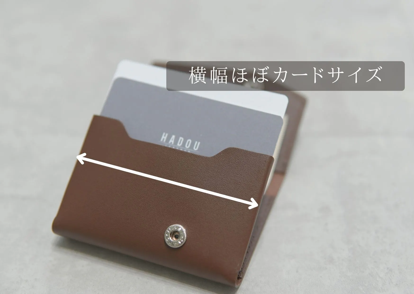 カード収納部のマチを縫わずに折り曲げ構造にすることで実現した、横幅がほぼカードサイズ(カード幅8.5cm、財布幅9cm)の極小財布。