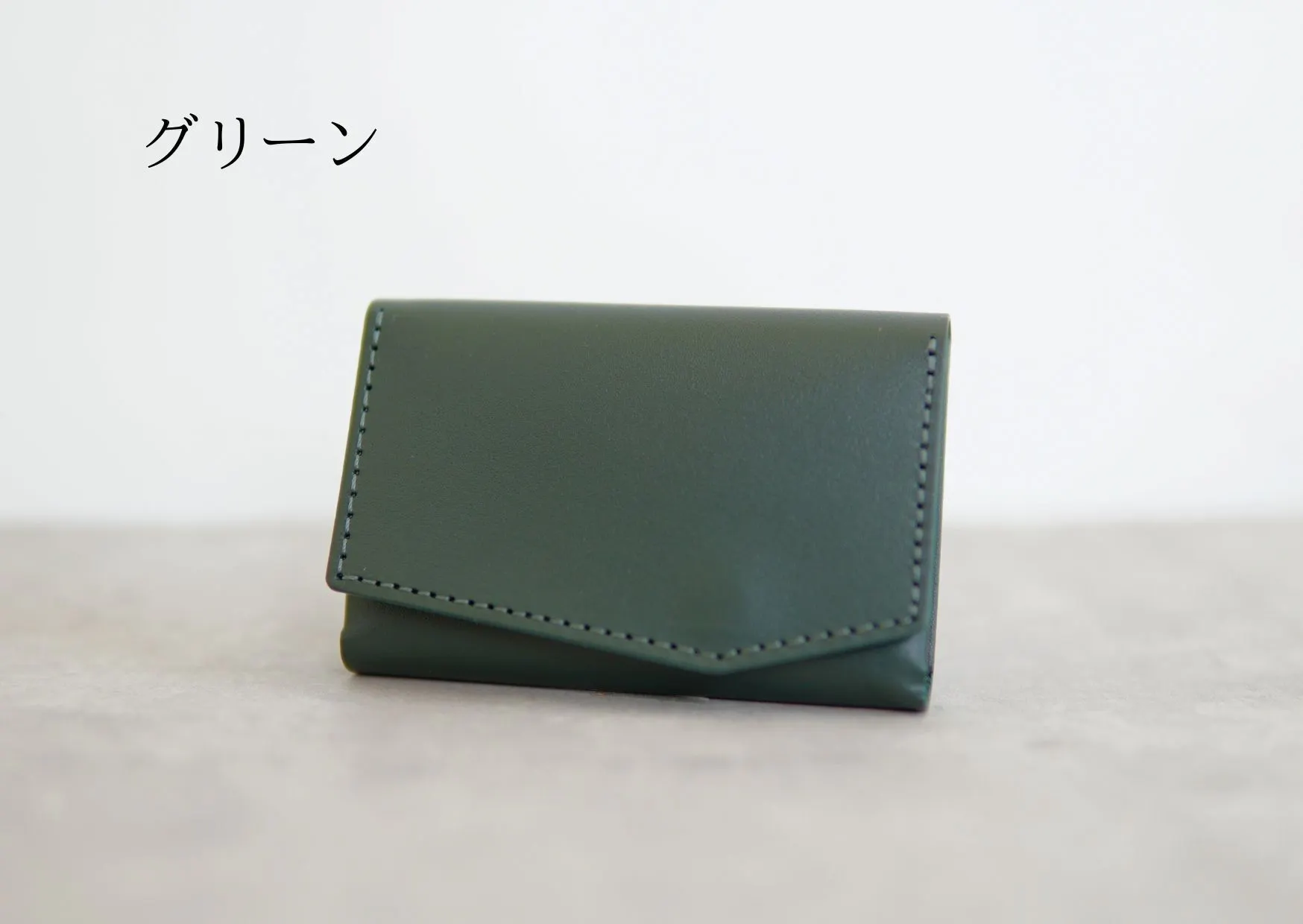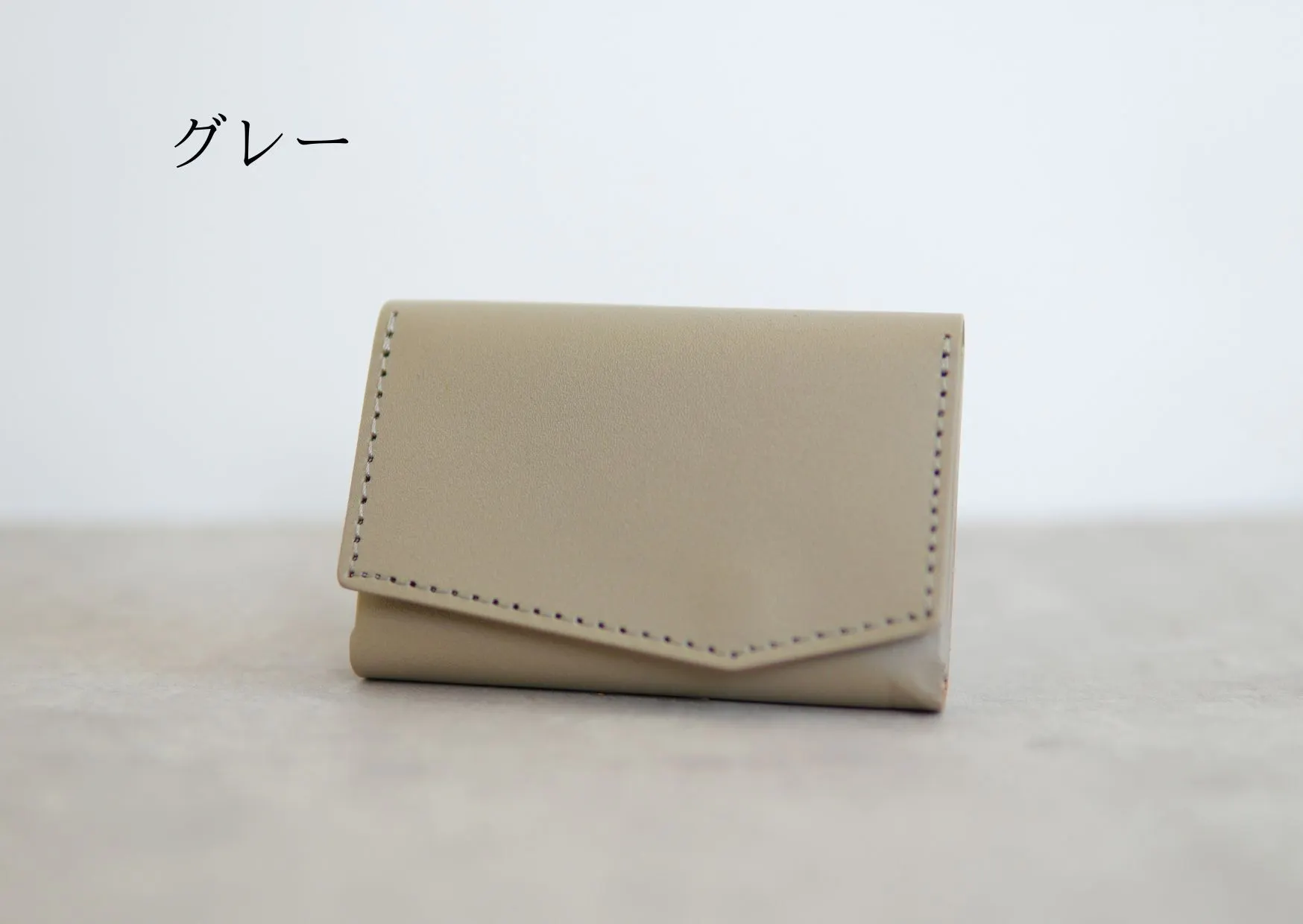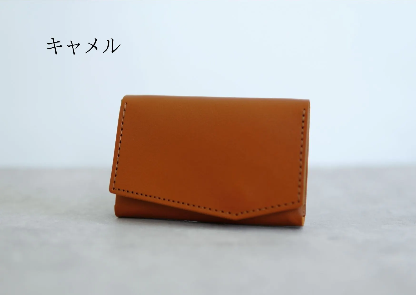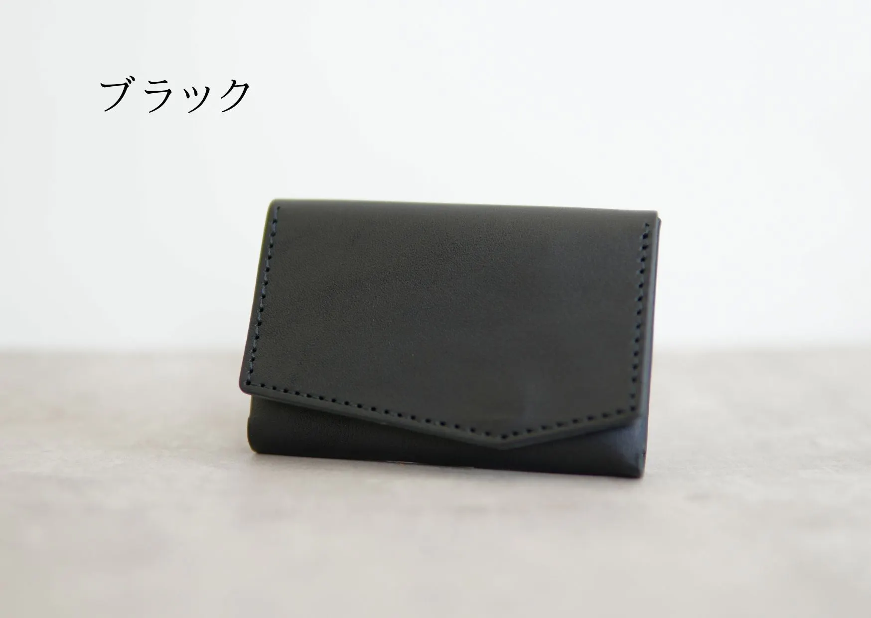 カード収納部のマチを縫わずに折り曲げ構造にすることで実現した、横幅がほぼカードサイズ(カード幅8.5cm、財布幅9cm)の極小財布。