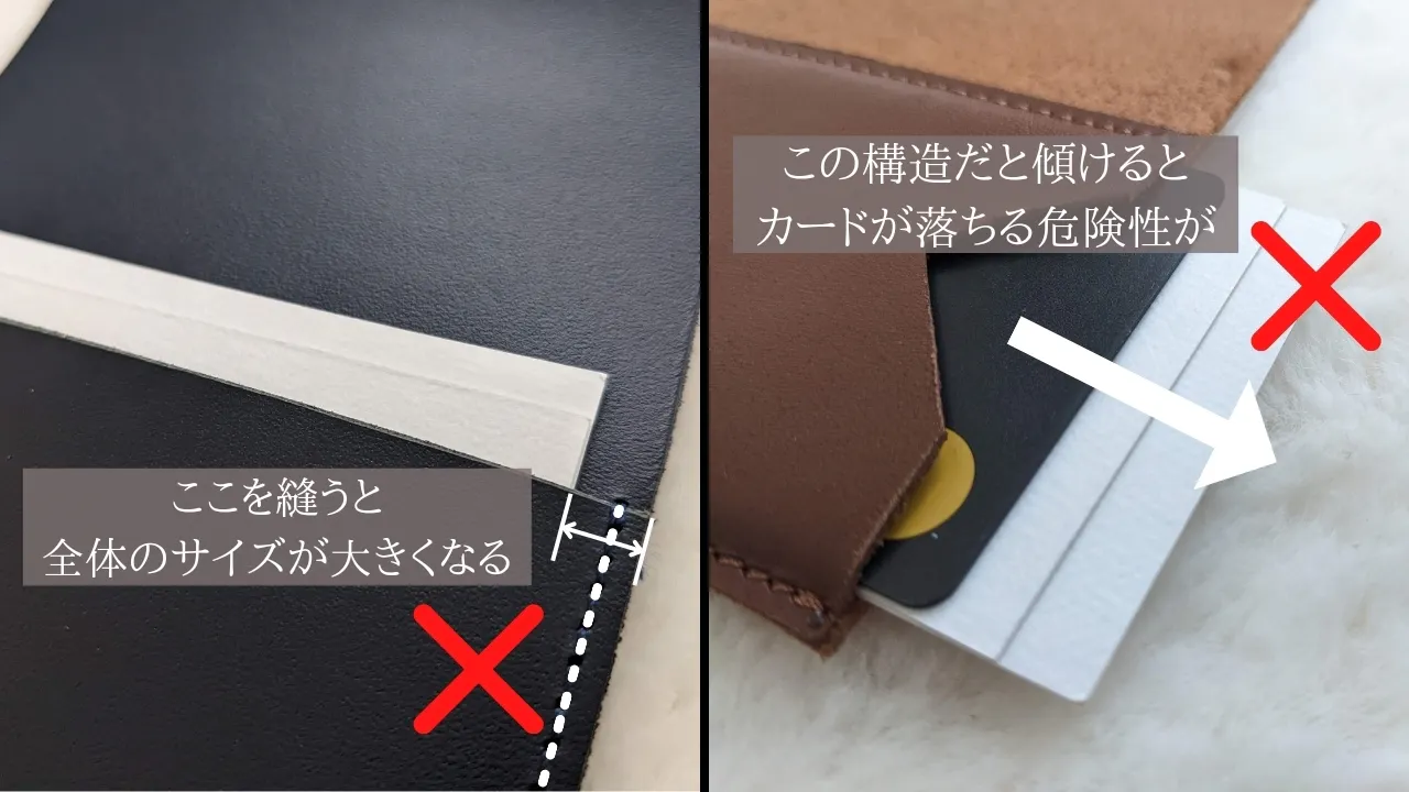 端を縫うと縫い代ができてしまうのでどうしてもサイズが大きくなってしまいます。また、今回製作した財布はカードの収納が横向きなので、他の極小財布によくあるような、規定枚数カードを入れないと傾けたときにカードが抜け落ちてしまうという心配もありません。